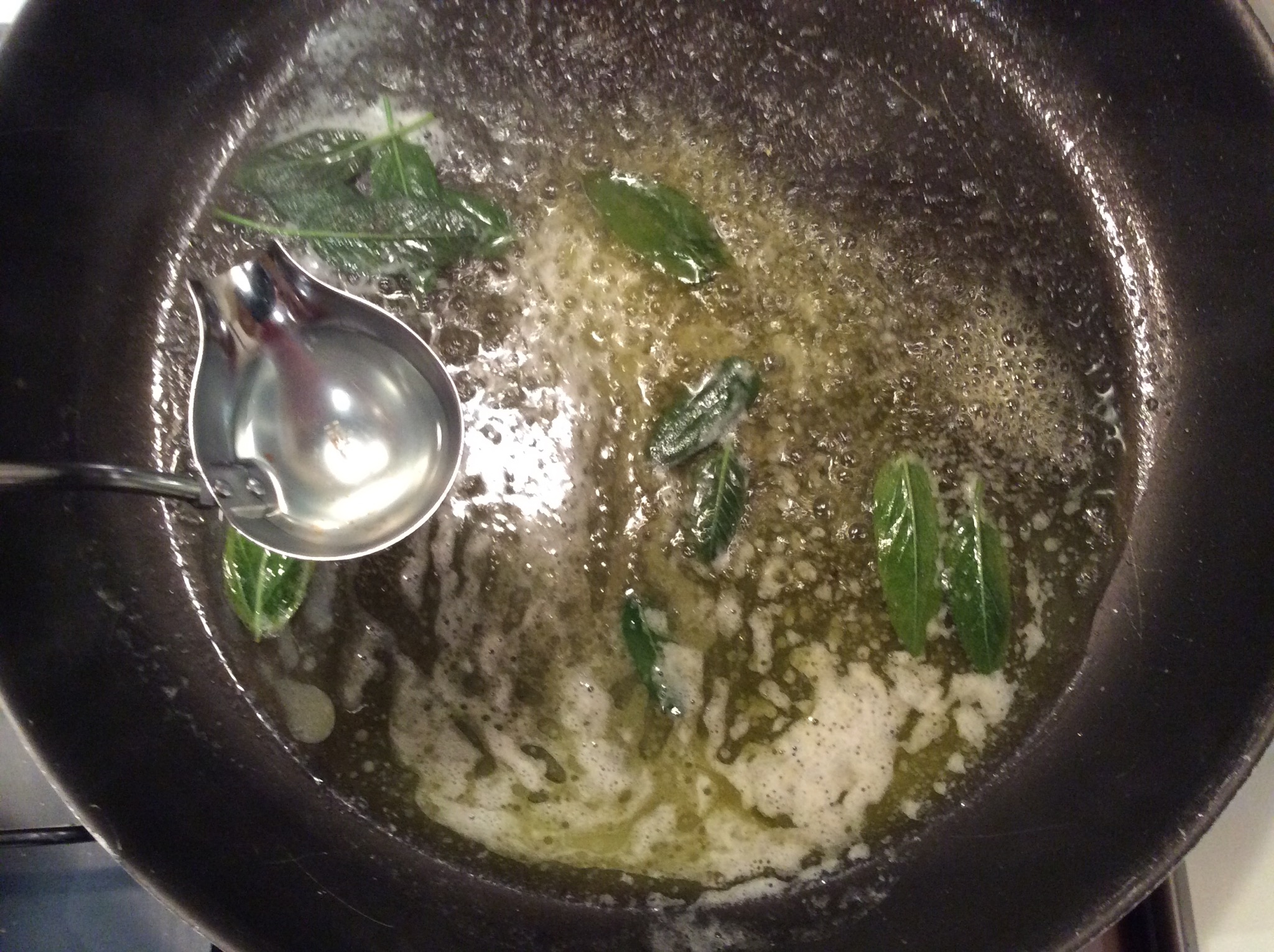 Intanto in una padella verso il burro l’olio e le foglie di salvia, lascio sciogliere e aggiungo un mestolino di acqua di cottura, muovo avanti e indietro la padella per emulsionare