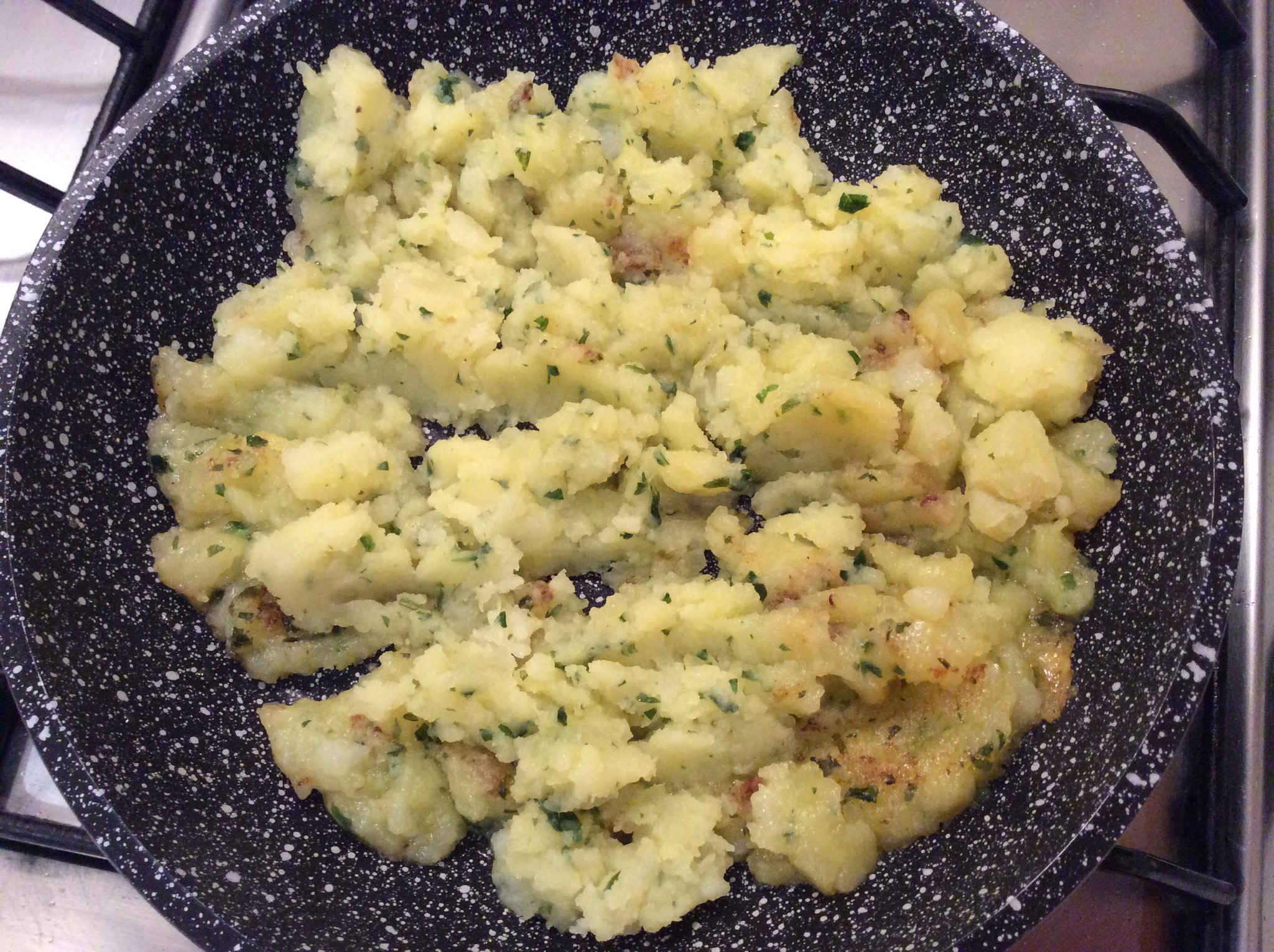 Per il tortino faccio lessare le patate poi le sbuccio e le schiaccio con uno schiaccia patate e le verso in una padella con una noce di burro e aggiungo sale, pepe e prezzemolo e le lascio colorire