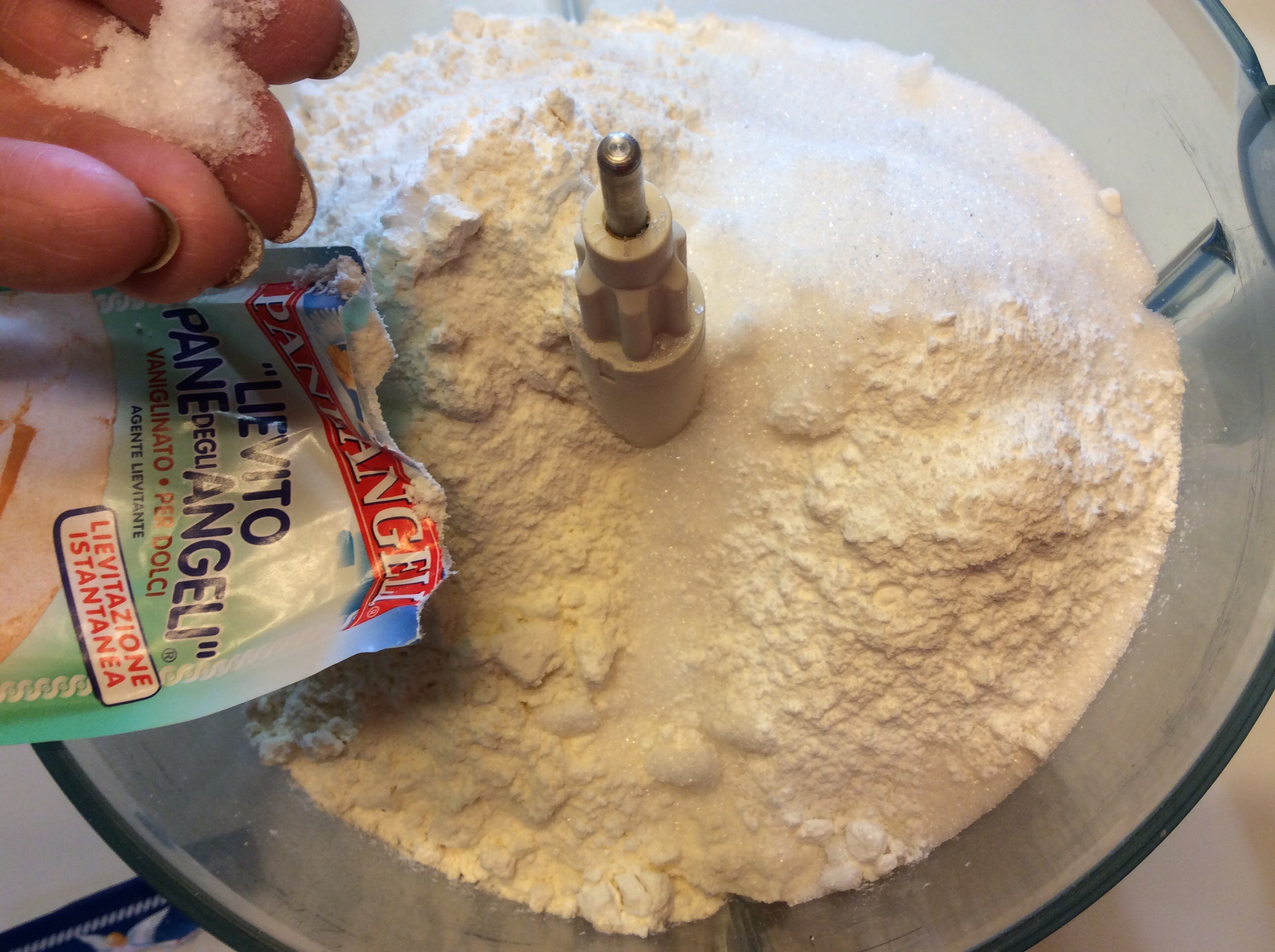 Nel mixer o in una ciotola( se impastate a mano) verso la farina, lo zucchero, un pizzico di sale e mezza bustina di lievito