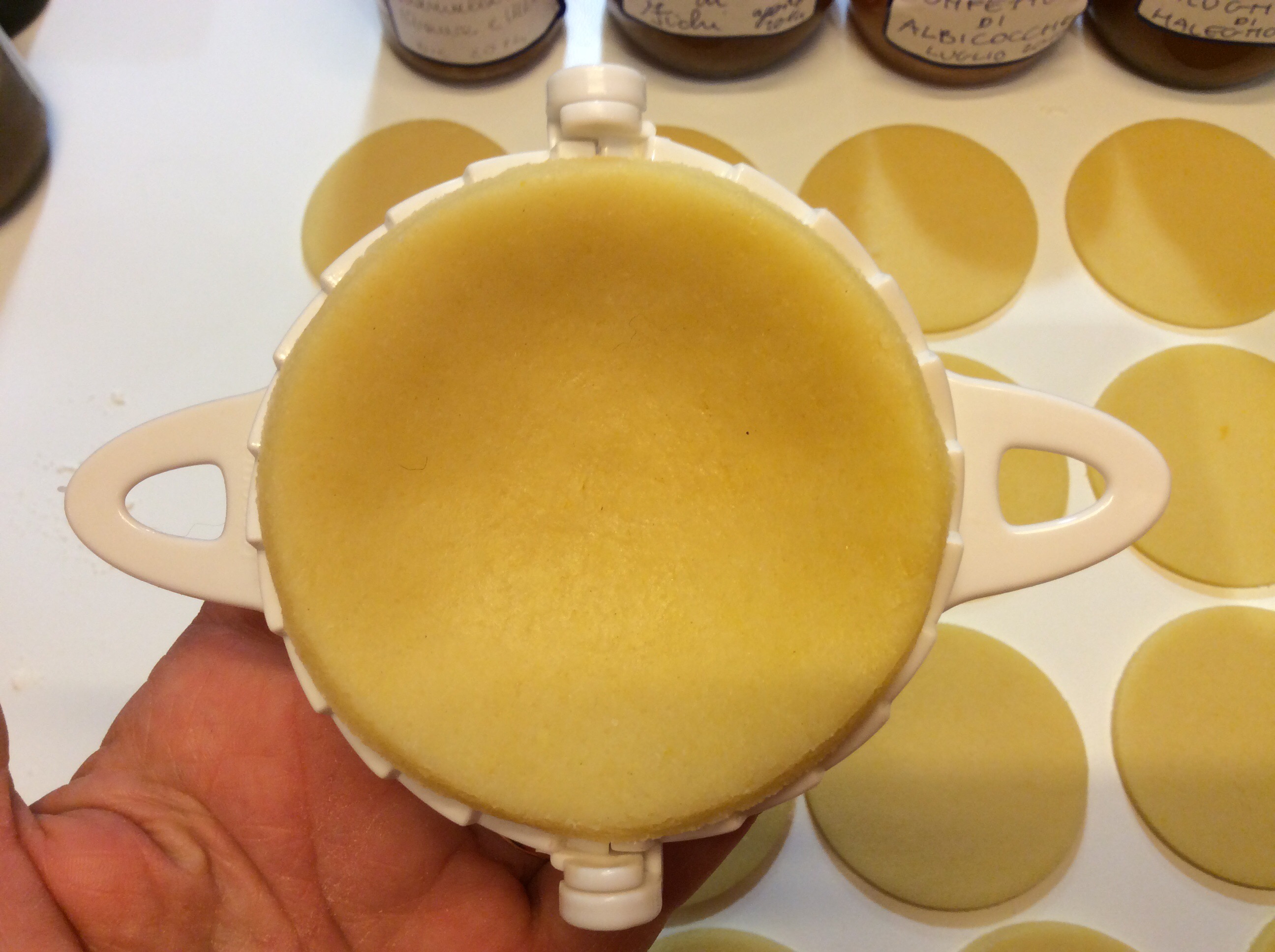 Appoggio il disco di pasta nel mio fantastico stampo per tortelli, se non lo avete potete chiudere il tortello e sigillarlo con i rebbi di una forchetta
