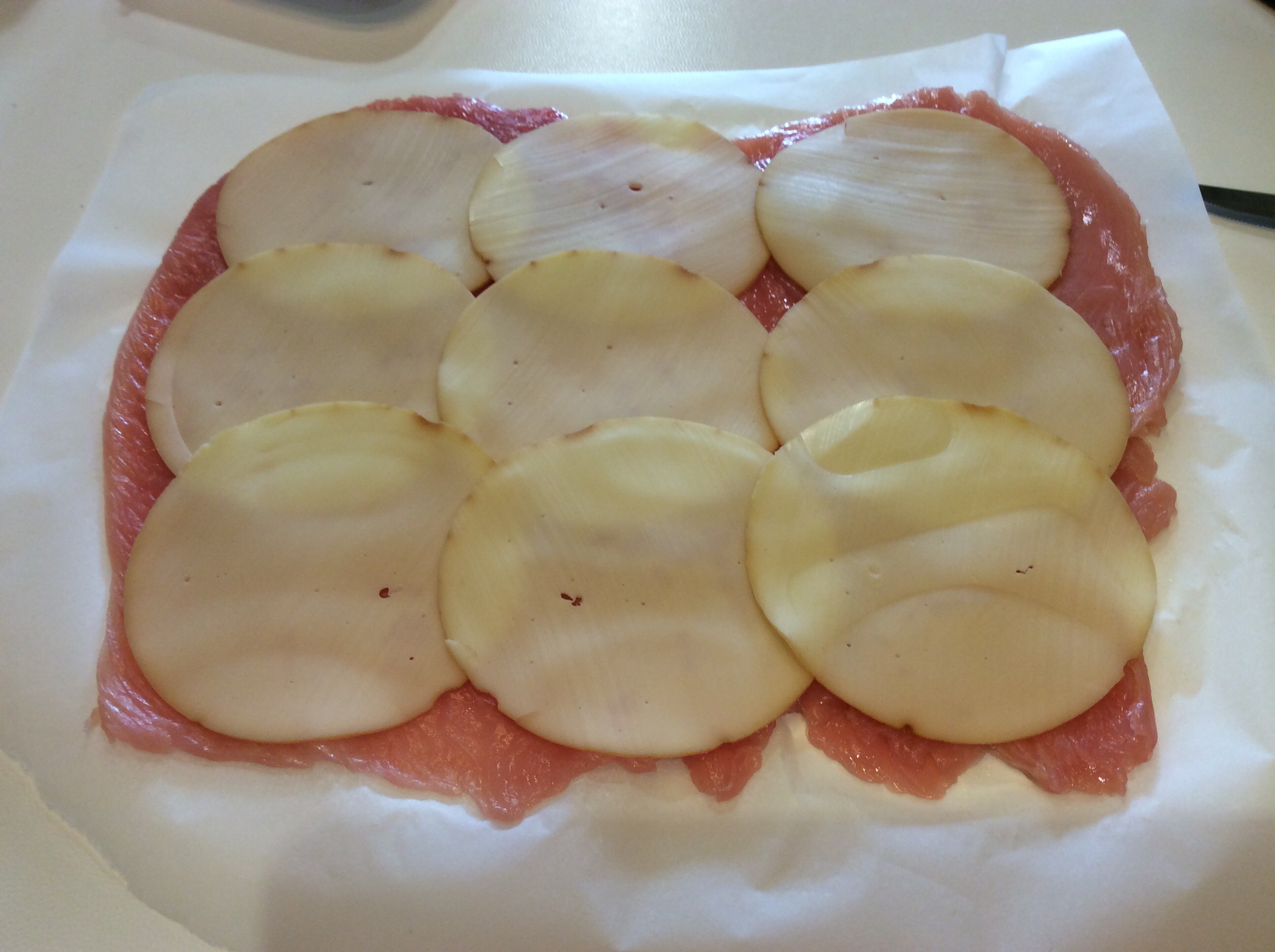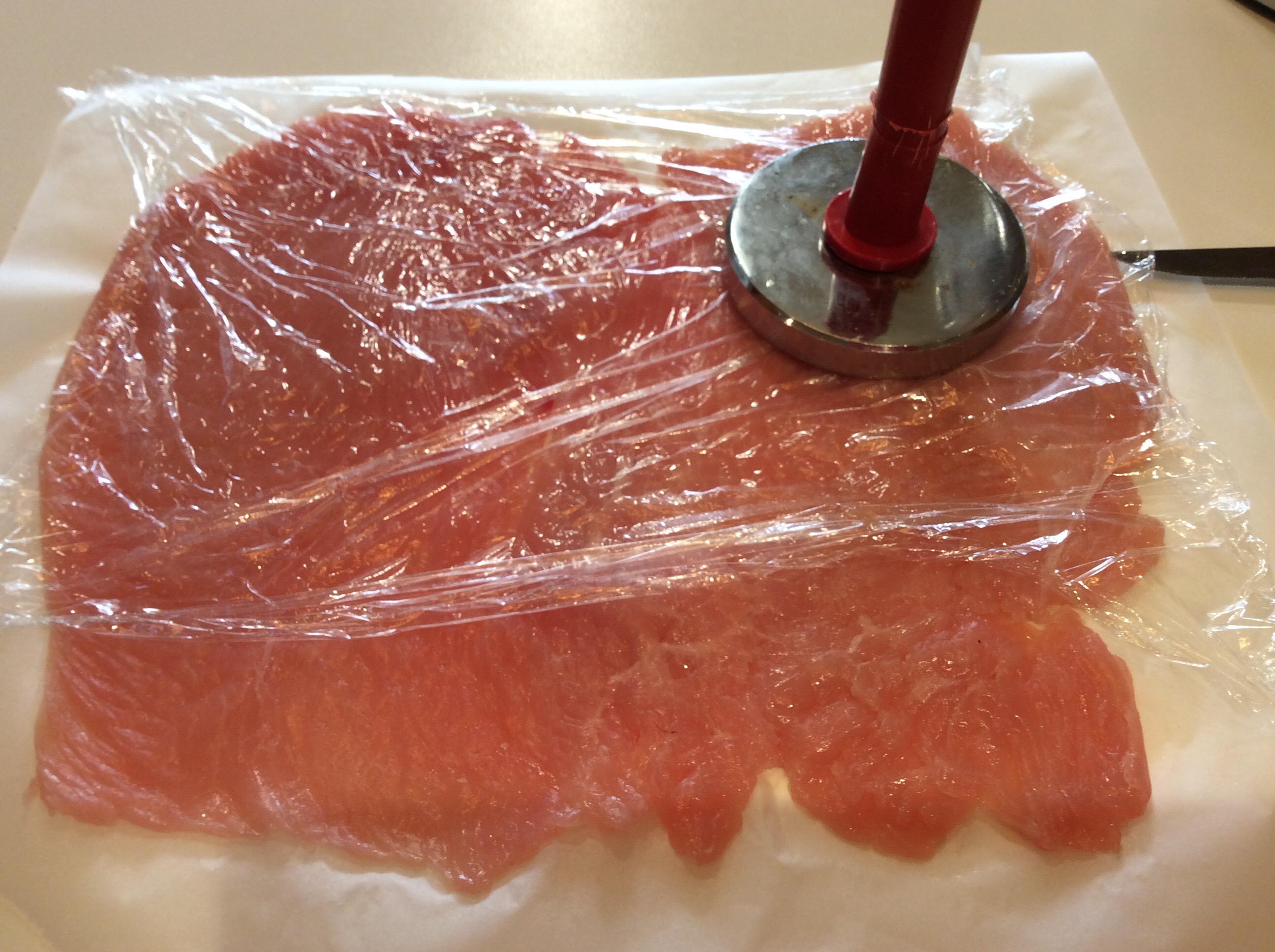 Appoggio le fette di tacchino su un foglio di carta forno affiancandole e formando un rettangolo, appoggio un foglio di pellicola e batto bene deve essere sottile e uniforme