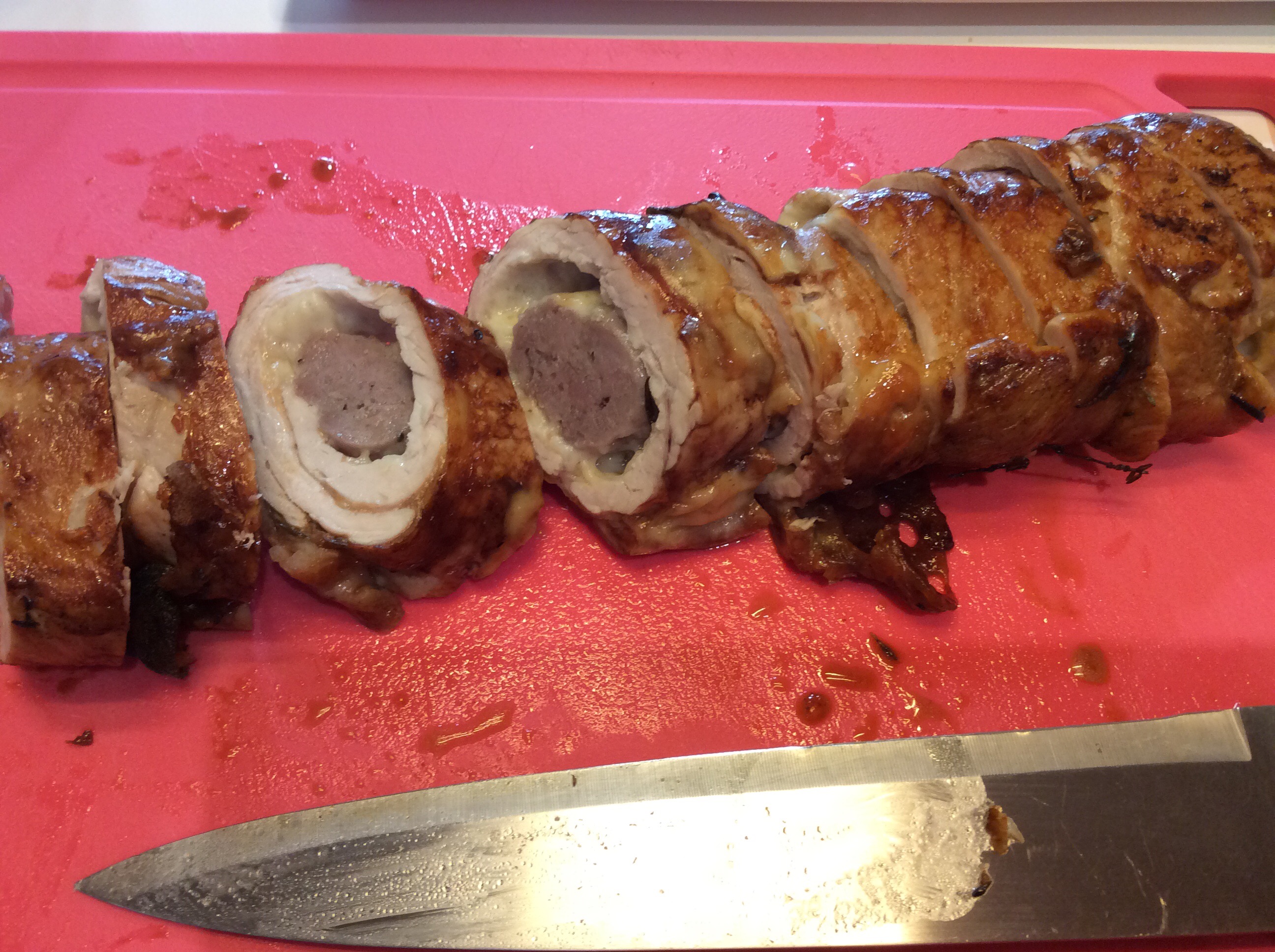 Spello e formo un rotolo di salsiccia lunga coma il tacchino e lo appoggio all’estremità
