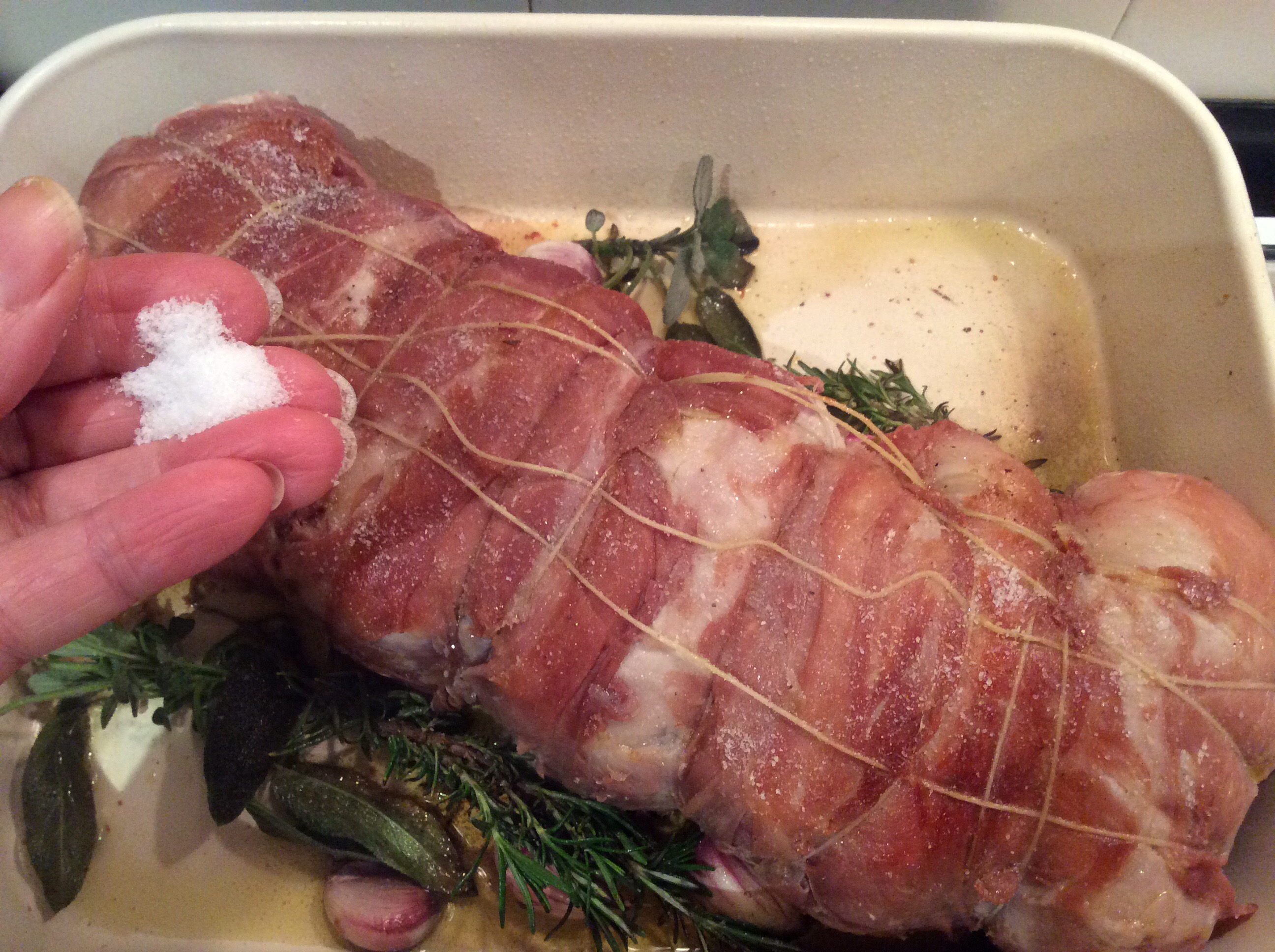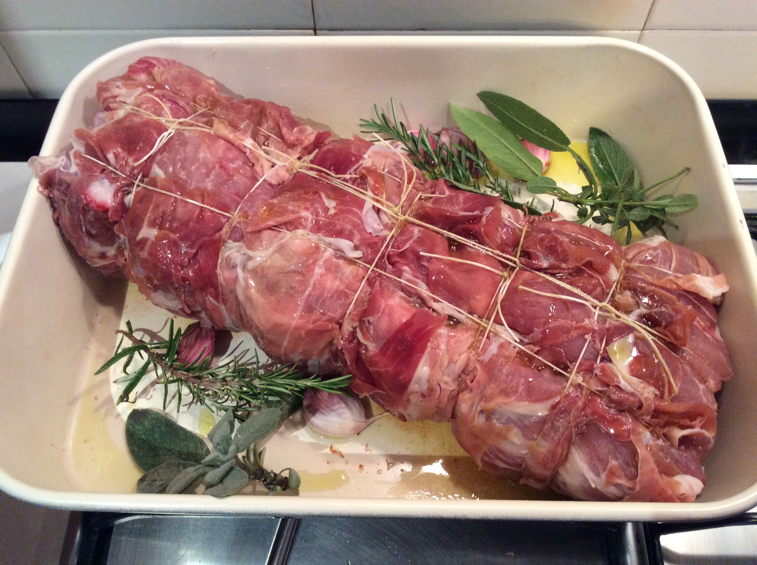 In una teglia appoggio l’arrosto verso dell’olio gli spicchi di aglio, salvia e rosmarino e scaldo la teglia