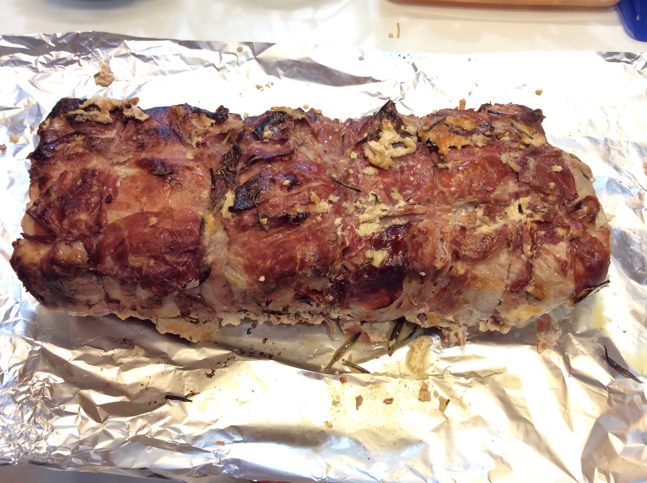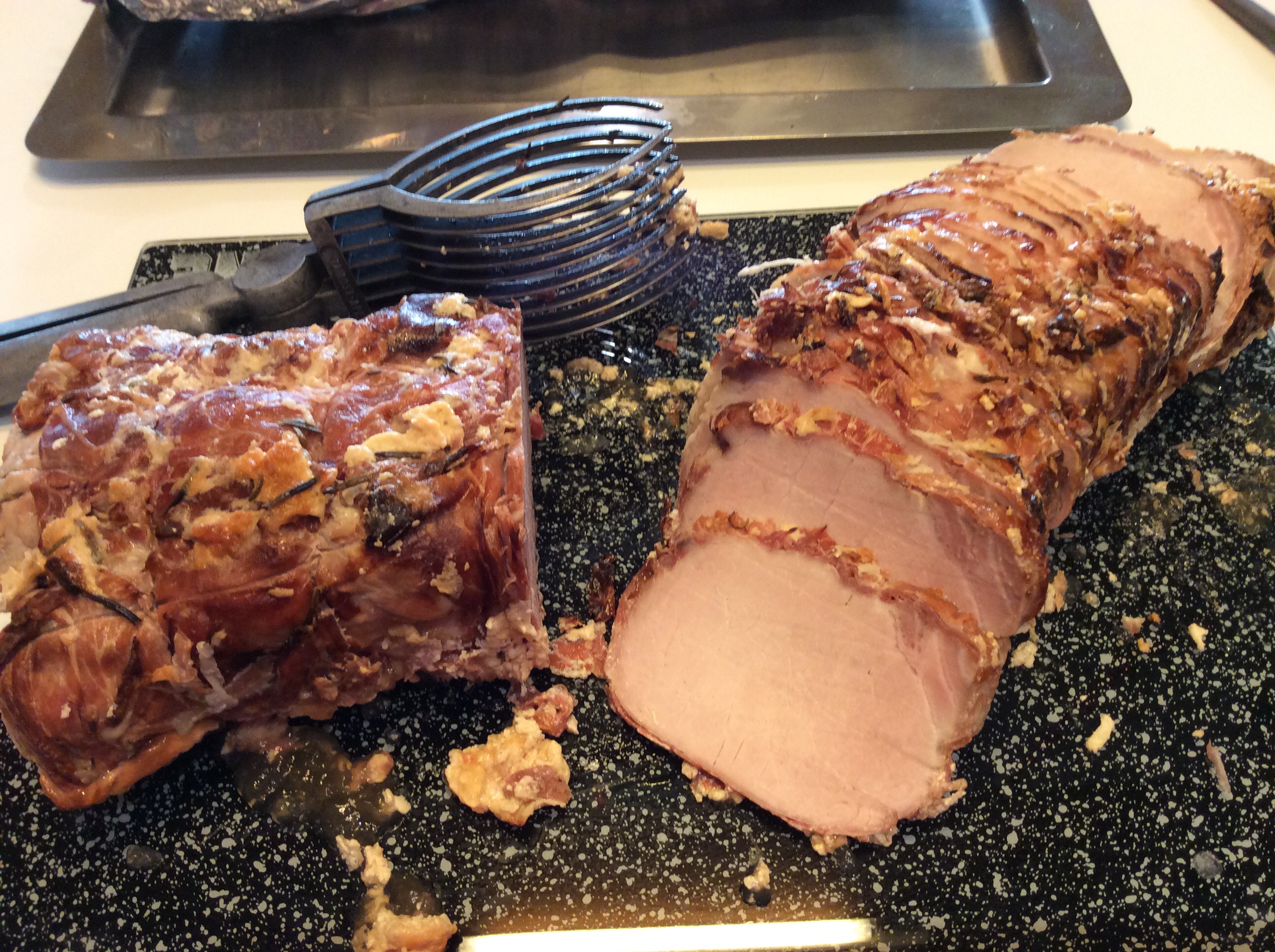 Inforno a 180 gradi per circa 1 ora e mezza, se avete un termometro per alimenti inseritelo al centro del’arrosto, è pronto quando raggiunge i 65 gradi al cuore, quando è cotto lo scolo dal sugo e lo appoggio su un foglio di carta alluminio e tolgo gli spaghi