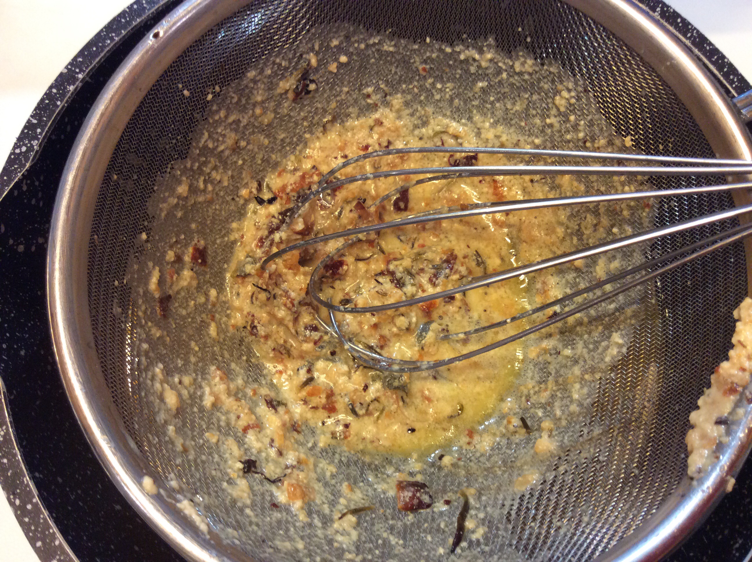 In un pentolino filtro il sugo, elimino l’aglio e schiaccio bene
