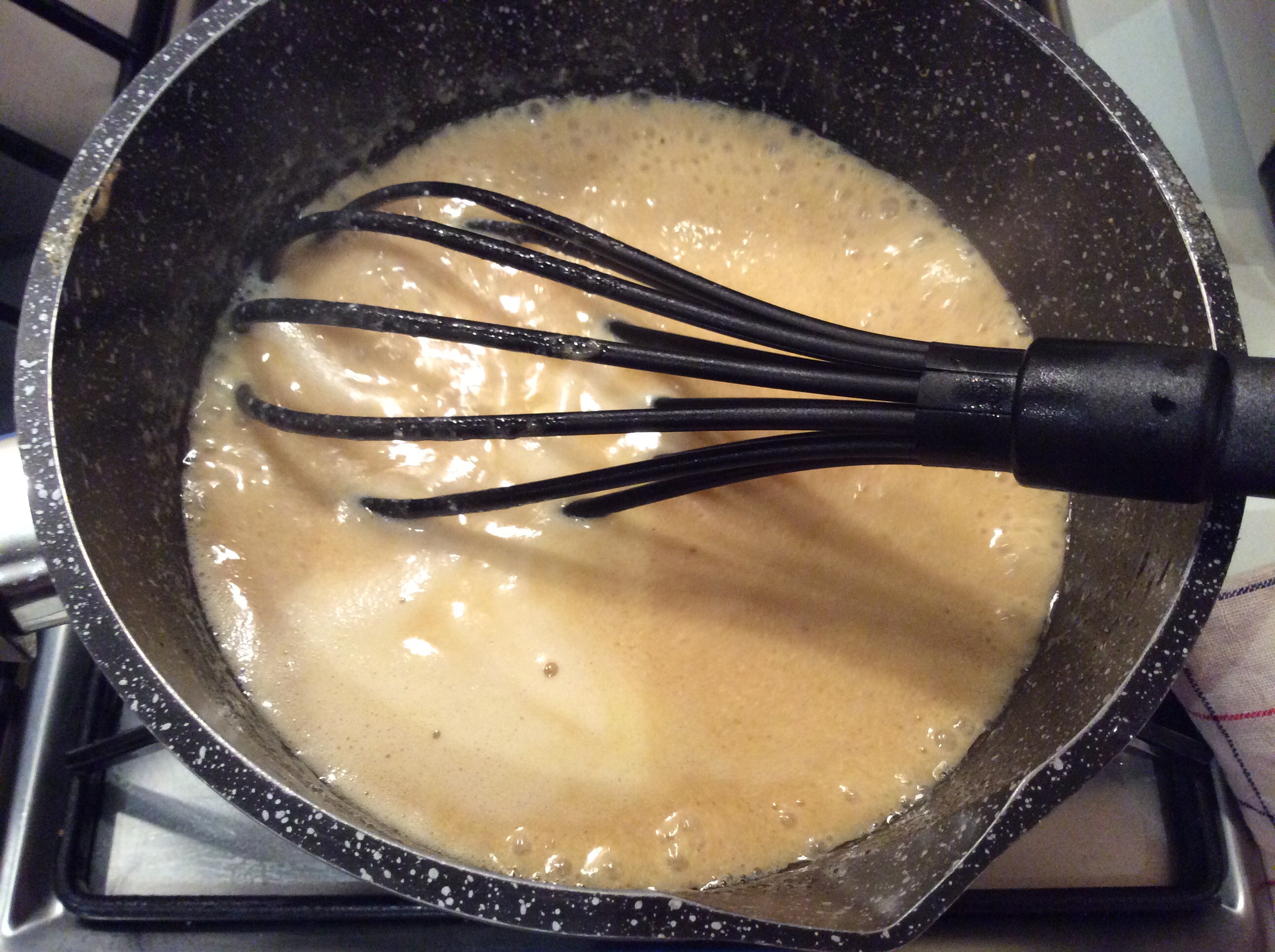 Porto a bollore mescolando bene con la frusta finché il sugo addensa ed è liscio e vellutato, se vi sembra vi siano grumi potete frullarlo con un mixer ad immersione