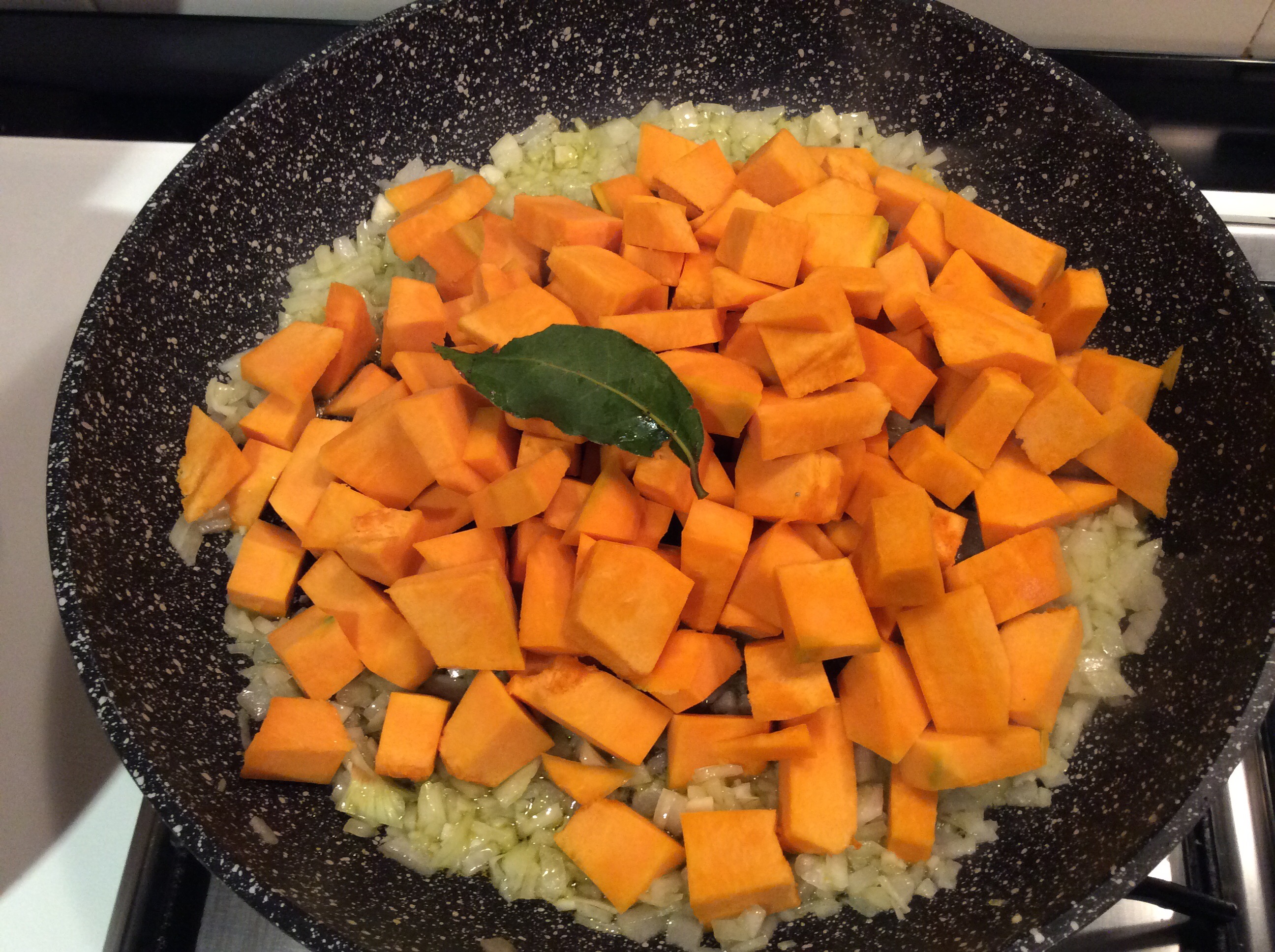 Sbuccio e taglio a pezzetti la zucca e la metto in una padella con la cipolla tritata, olio e la foglia di alloro