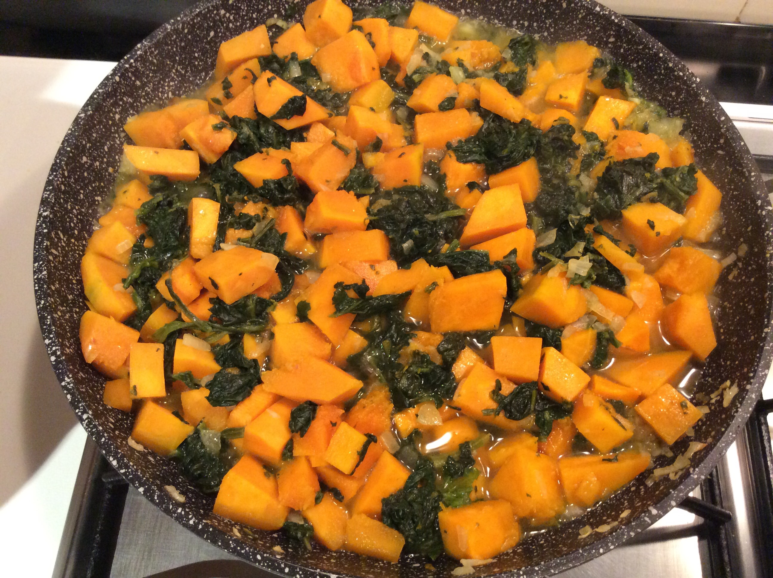 Lascio stufare finché la zucca è tenera, la schiaccio leggermente e la lascio raffreddare, tolgo la foglia di alloro