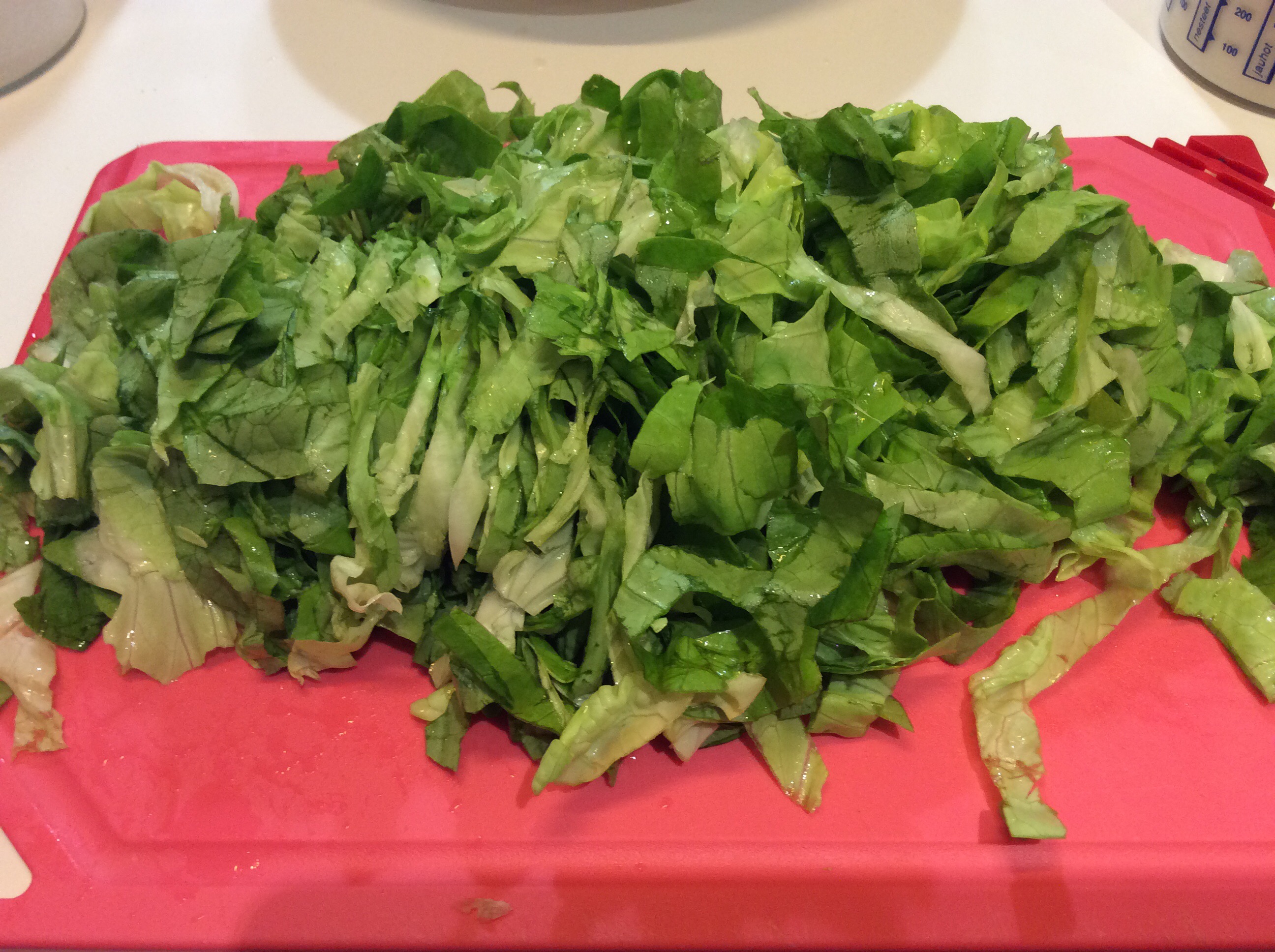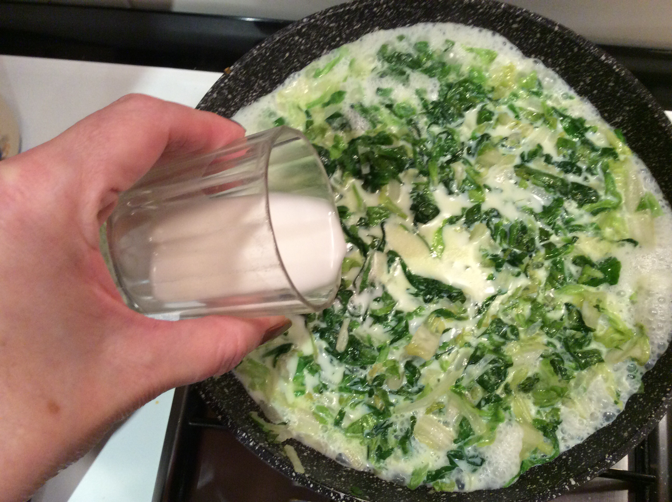 Aggiungo la lattuga e la lascio appassire, verso il latte e un cucchiaino di maizena che ho sciolto in due dita di acqua fredda