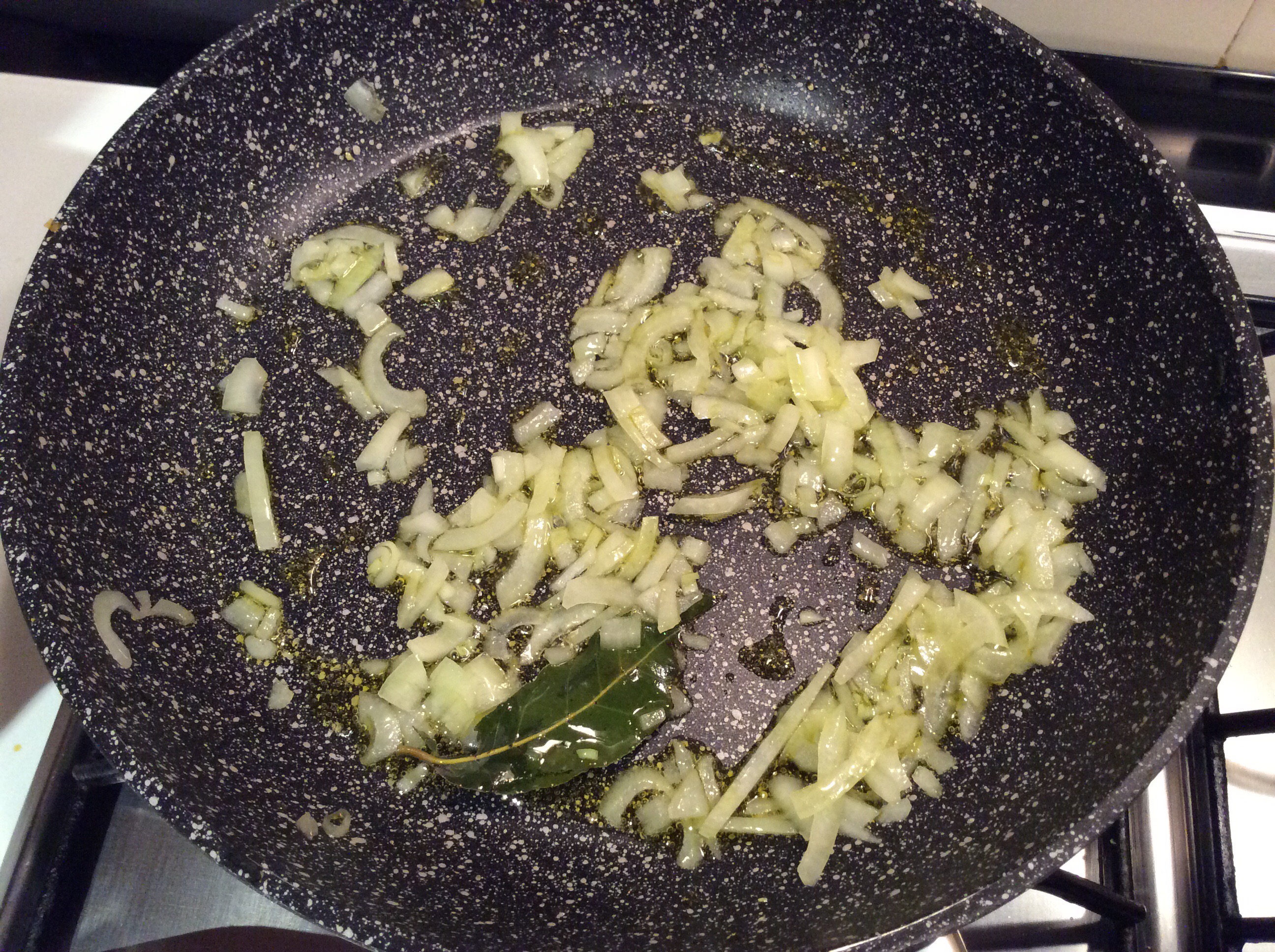 Trito la cipolla e la metto a soffriggere in padella con un goccio di olio e la foglia di alloro