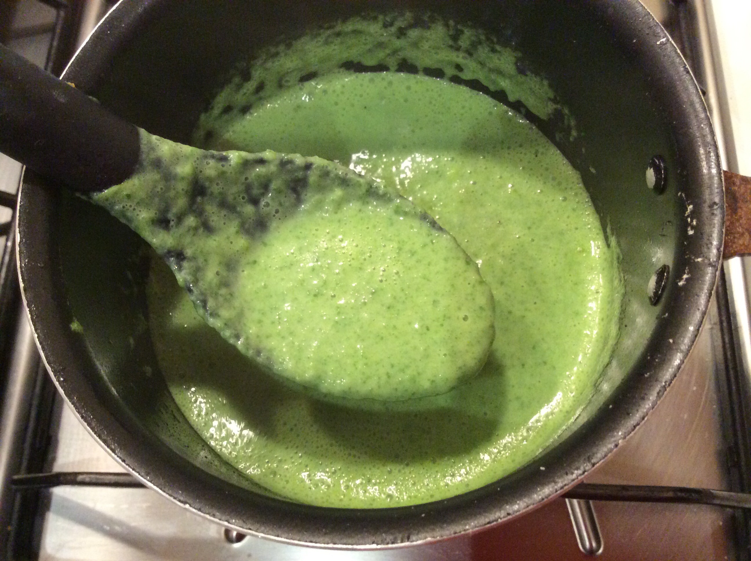 Lascio sobbollire 5 minuti quindi verso il composto nel bicchiere del mixer, tolgo la foglia di alloro e frullo aggiungo sale e pepe