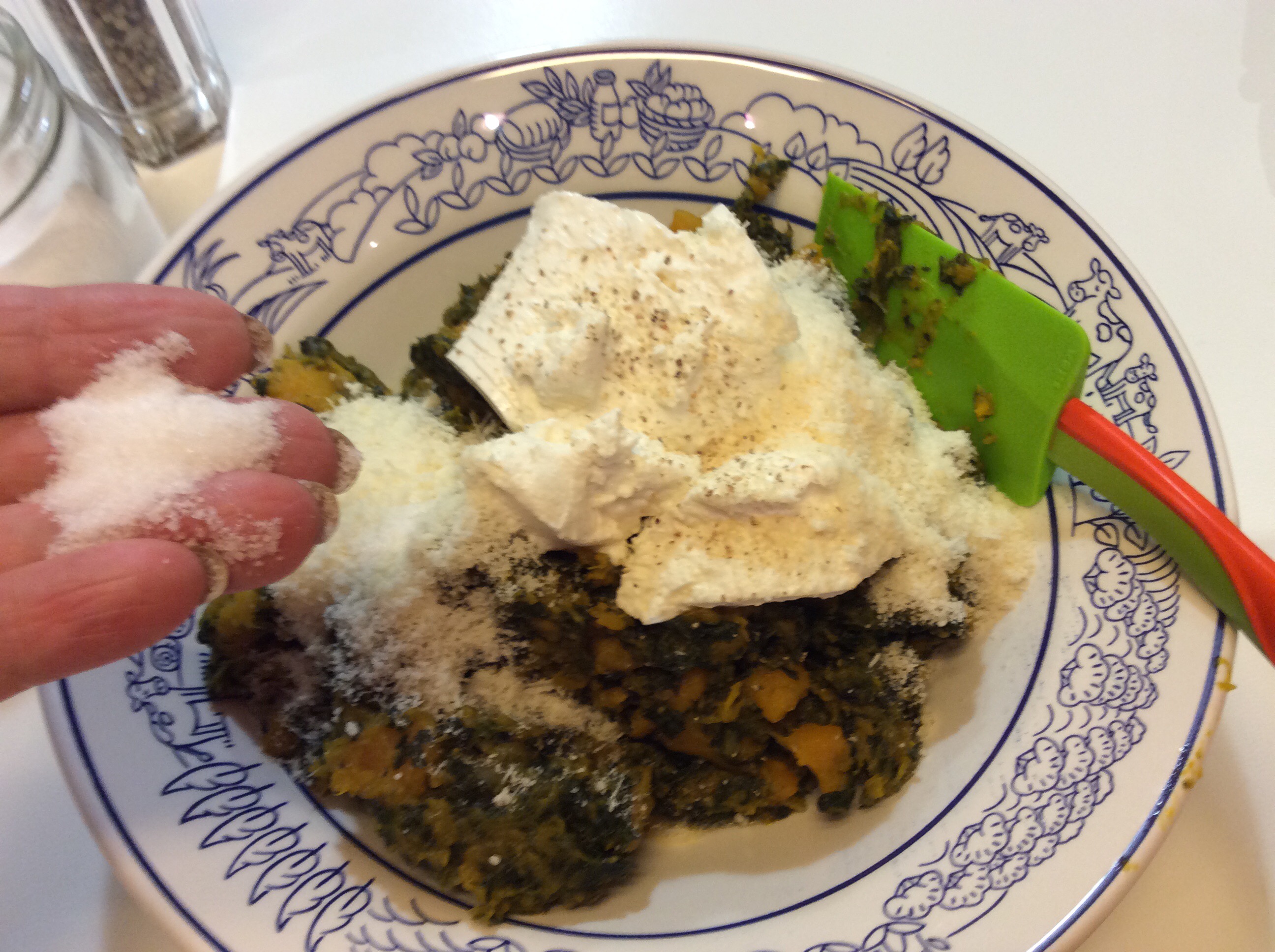 Quando l’impasto è freddo aggiungo la ricotta, il parmigiano, sale, pepe