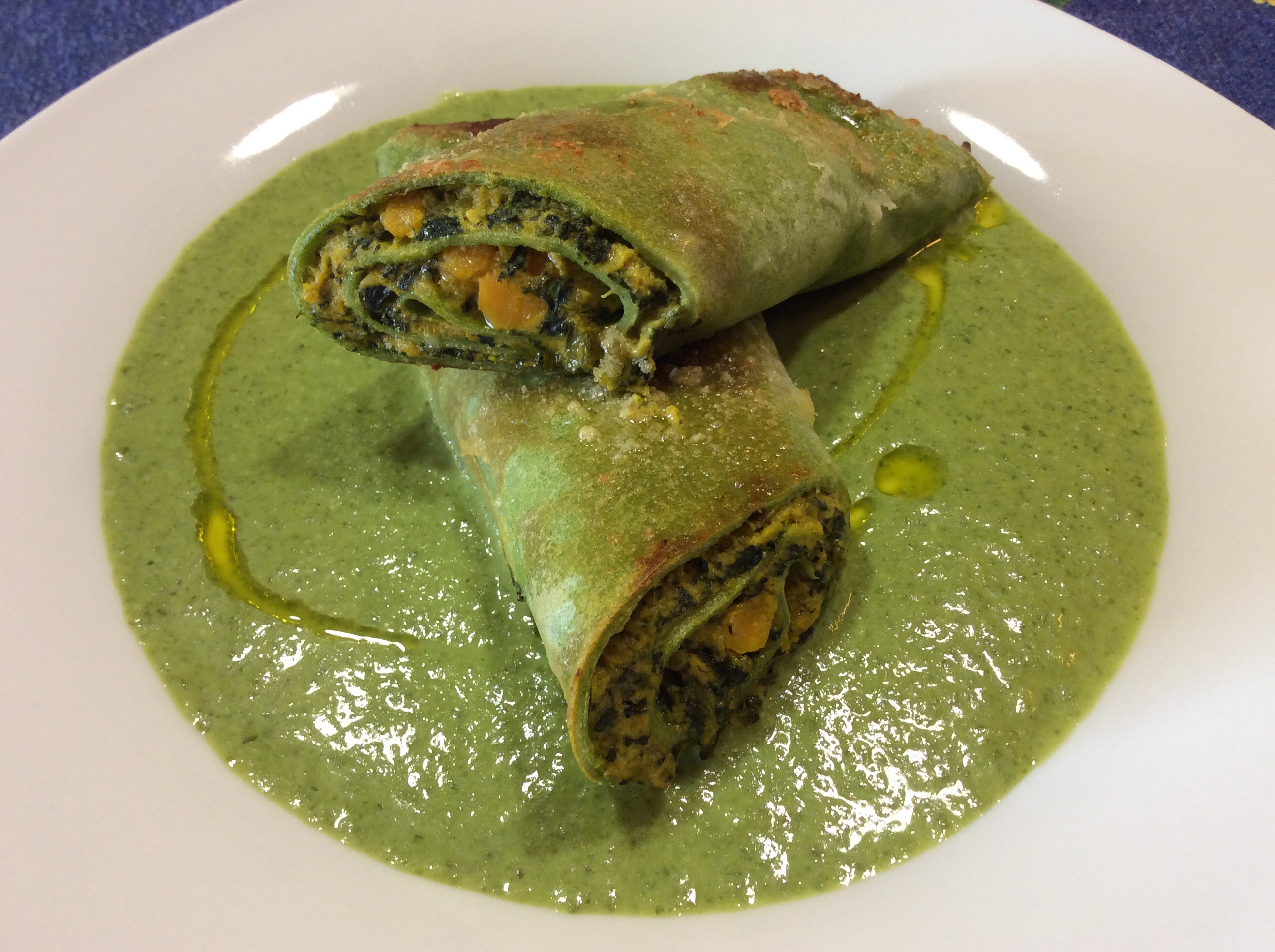 CRESPELLE VERDI CON ZUCCA SPINACI RICOTTA E CREMA DI LATTUGA