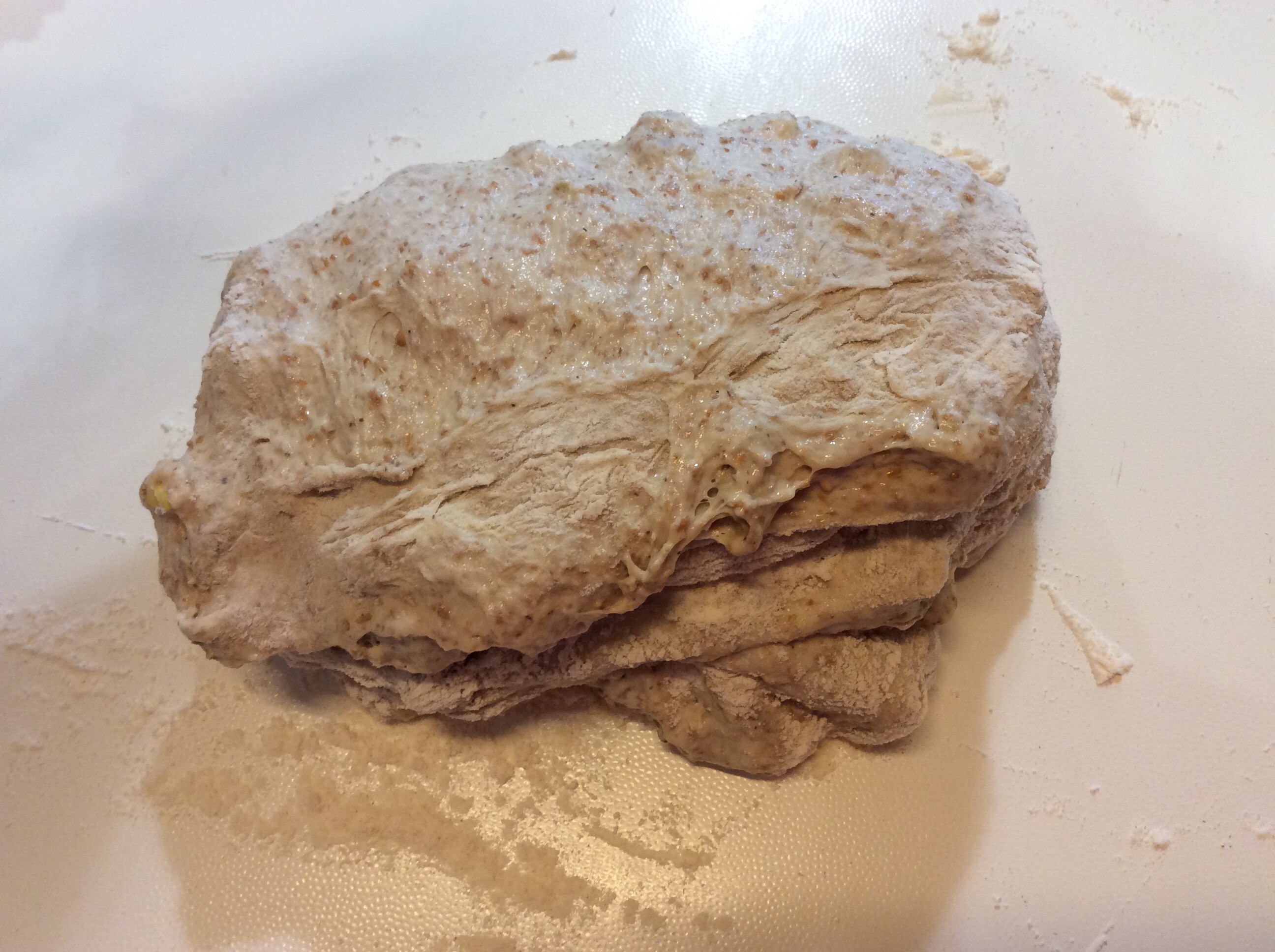 Aiutandomi con una spatola infarinata piego un lato dell’impasto fino a metà