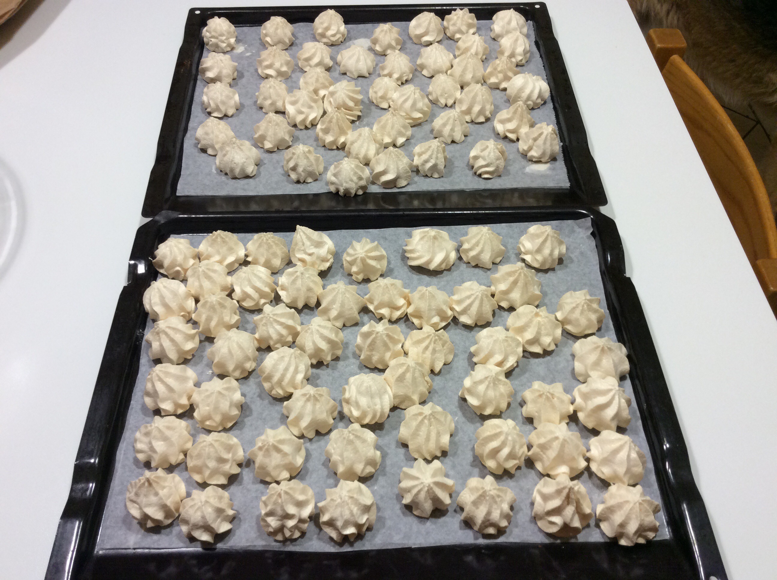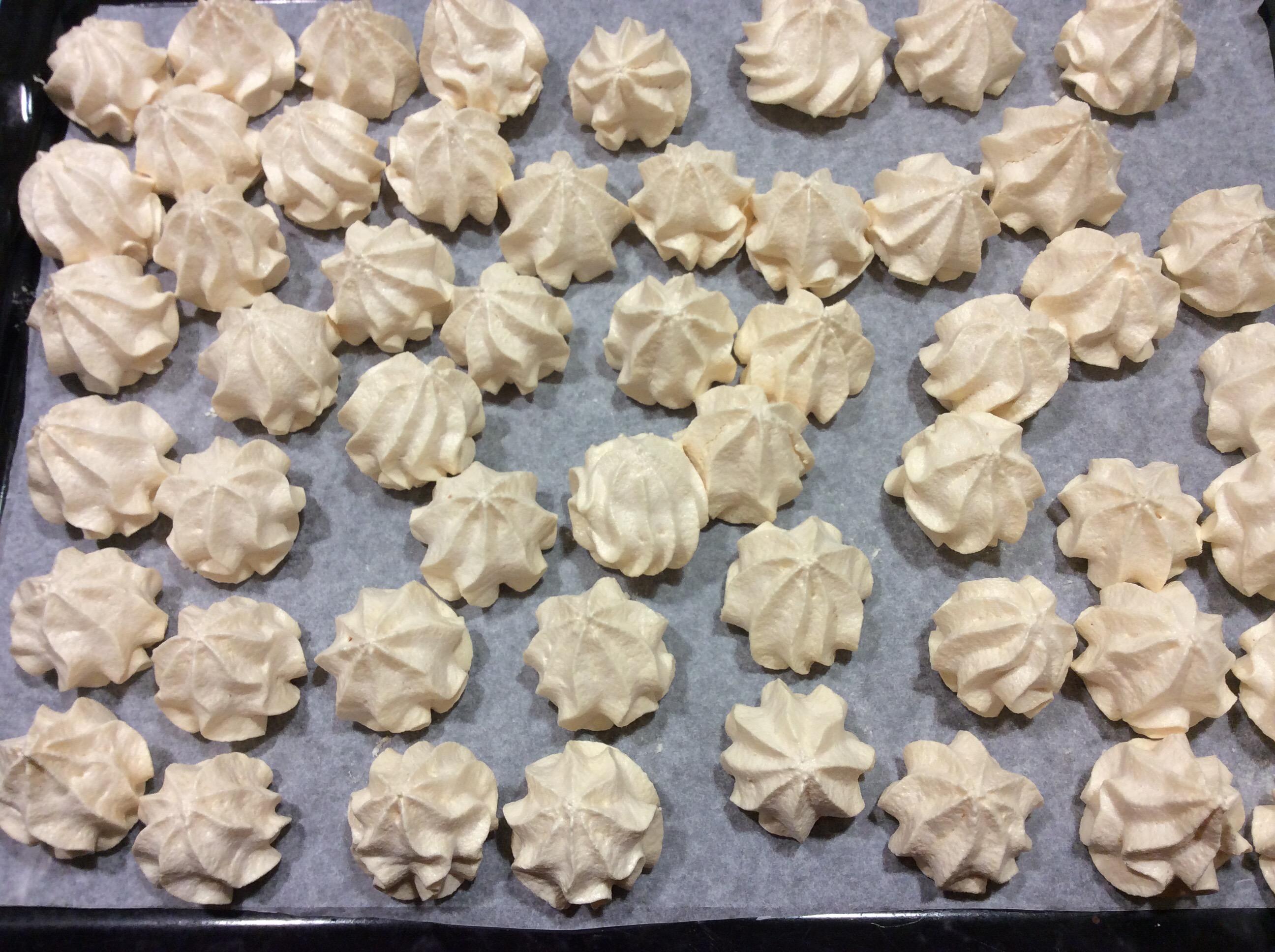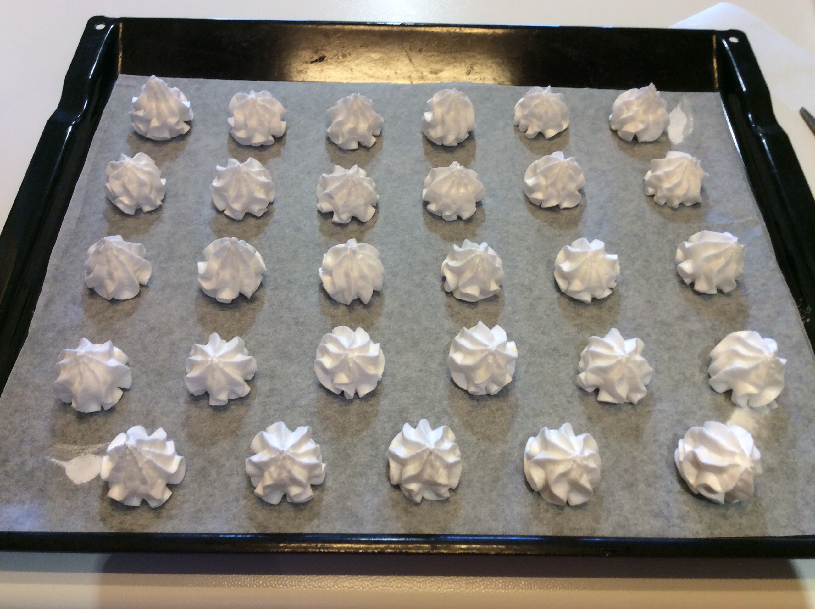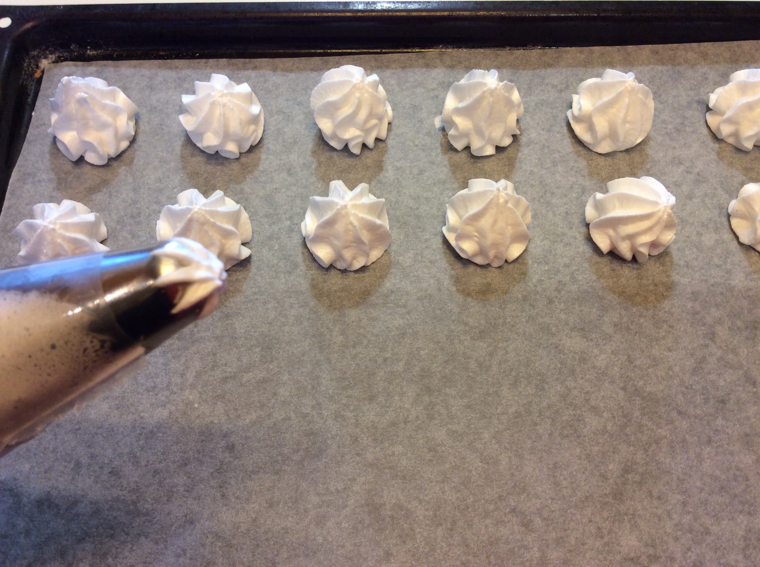 Fodero con carta forno le teglie da forno fissando il foglio con un pochino di meringa per evitare che il foglio si sollevi in cottura