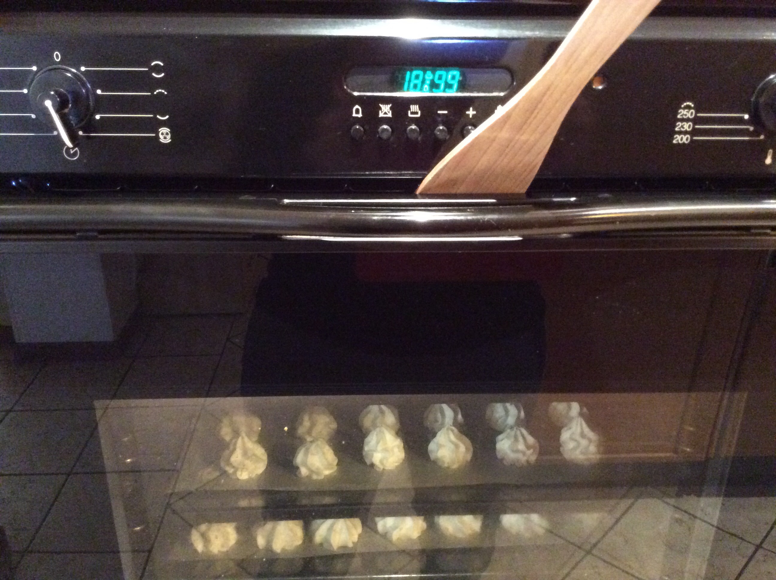 Inforno le teglie tenendo il portello del forno leggermente aperto per far uscire l’umidità, io ho inserito un mestolo piatto, oppure potete mettere una pallina di carta stagnola perché le meringhe devono asciugare benissimo, se vedete che iniziano a colorire abbassate un pochino la temperatura