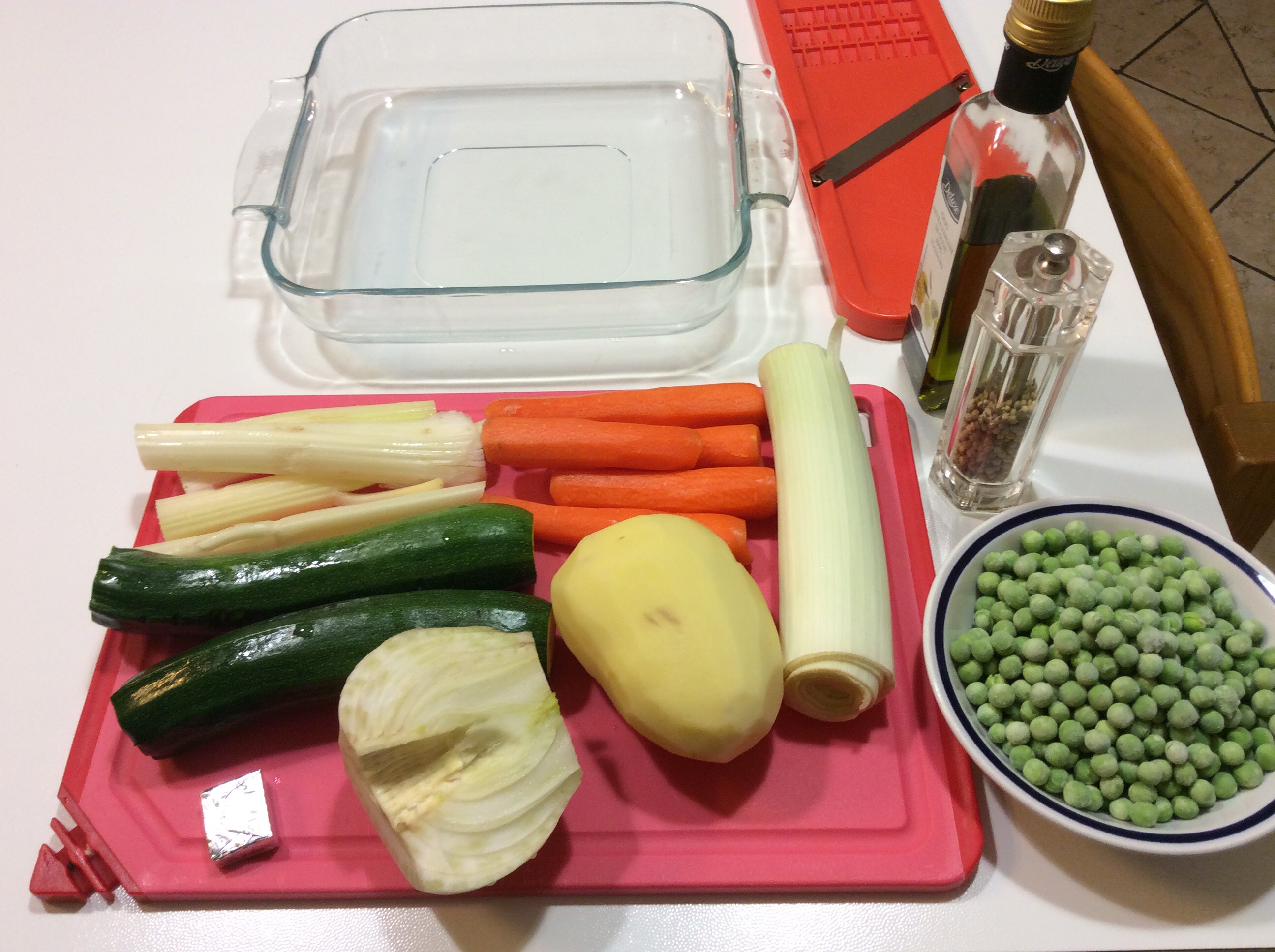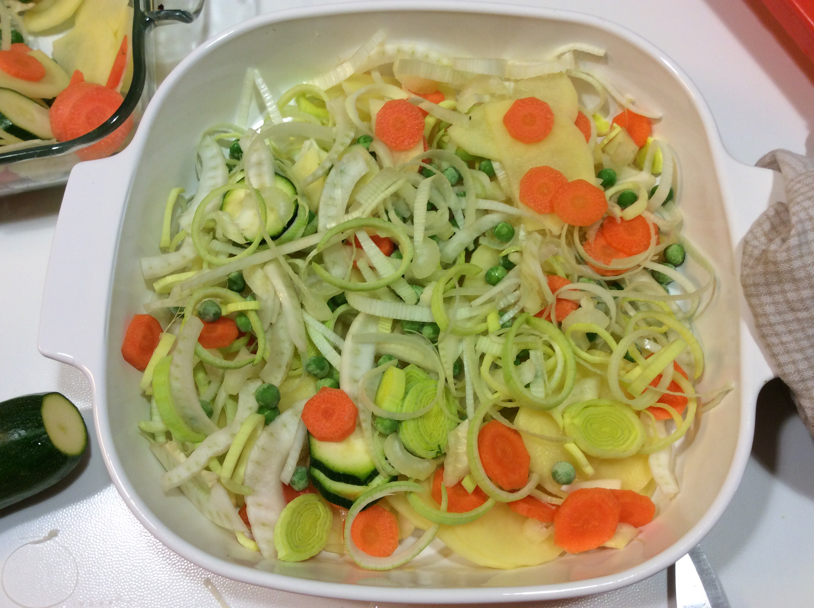 Dopo aver pulito e lavato le verdure le affetto con una mandolina o a fettine sottili con un coltello