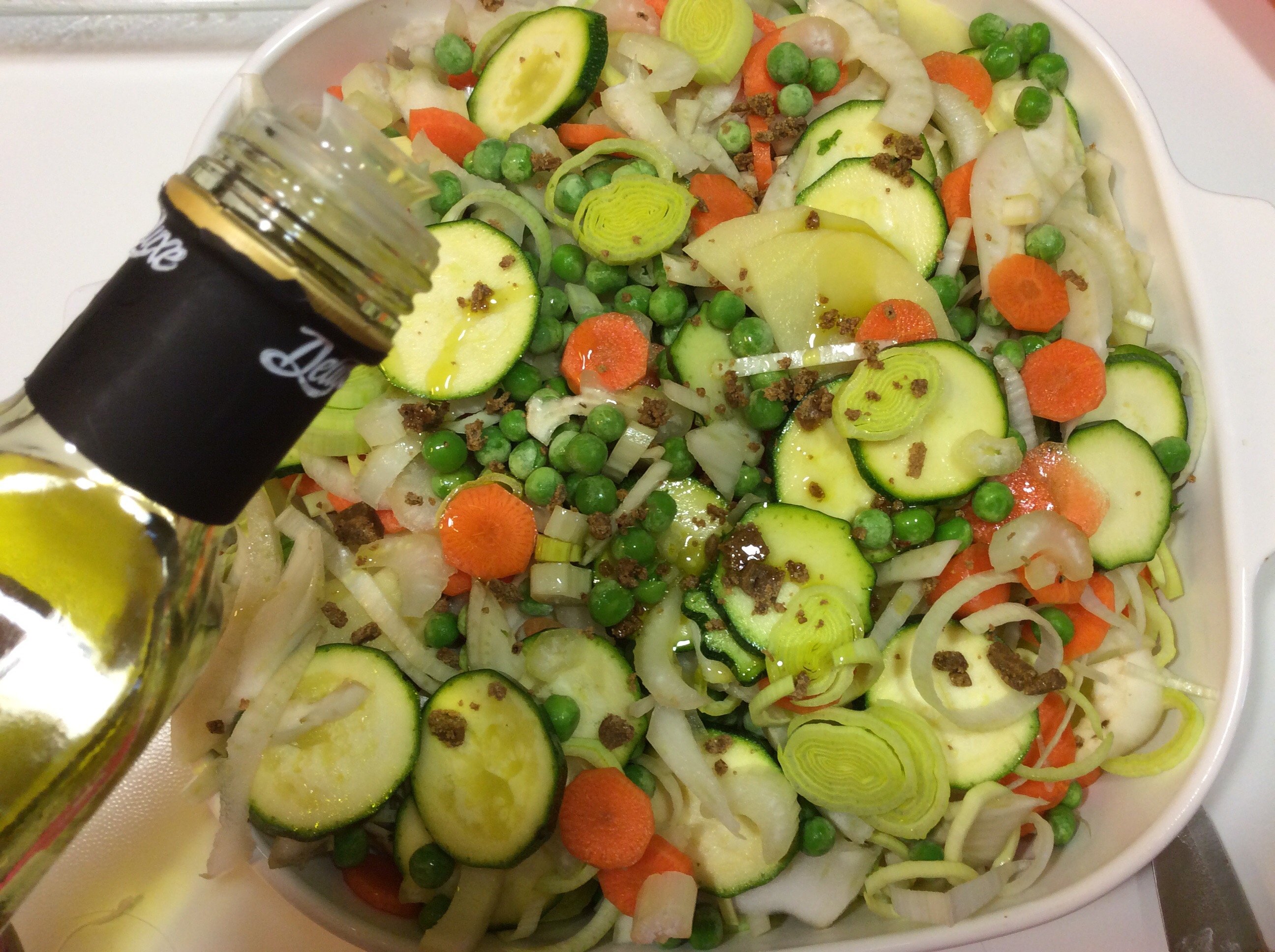 Poi ancora uno strato di verdure, l’altra metà del dado e un goccio di olio e una macinata di pepe, mescolo bene per amalgamare le verdure