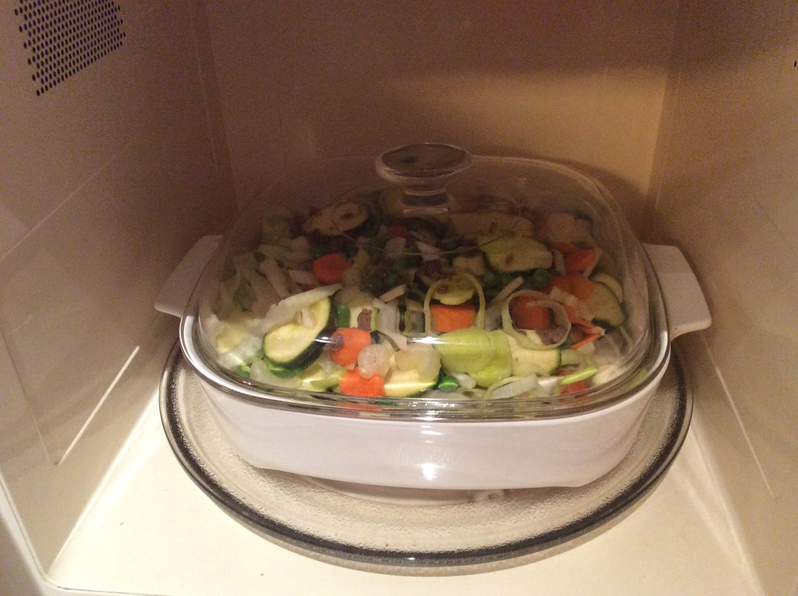 Prendo una pirofila adatta per il microonde e verso alla base un goccio di olio e aggiungo le verdure mischiandole