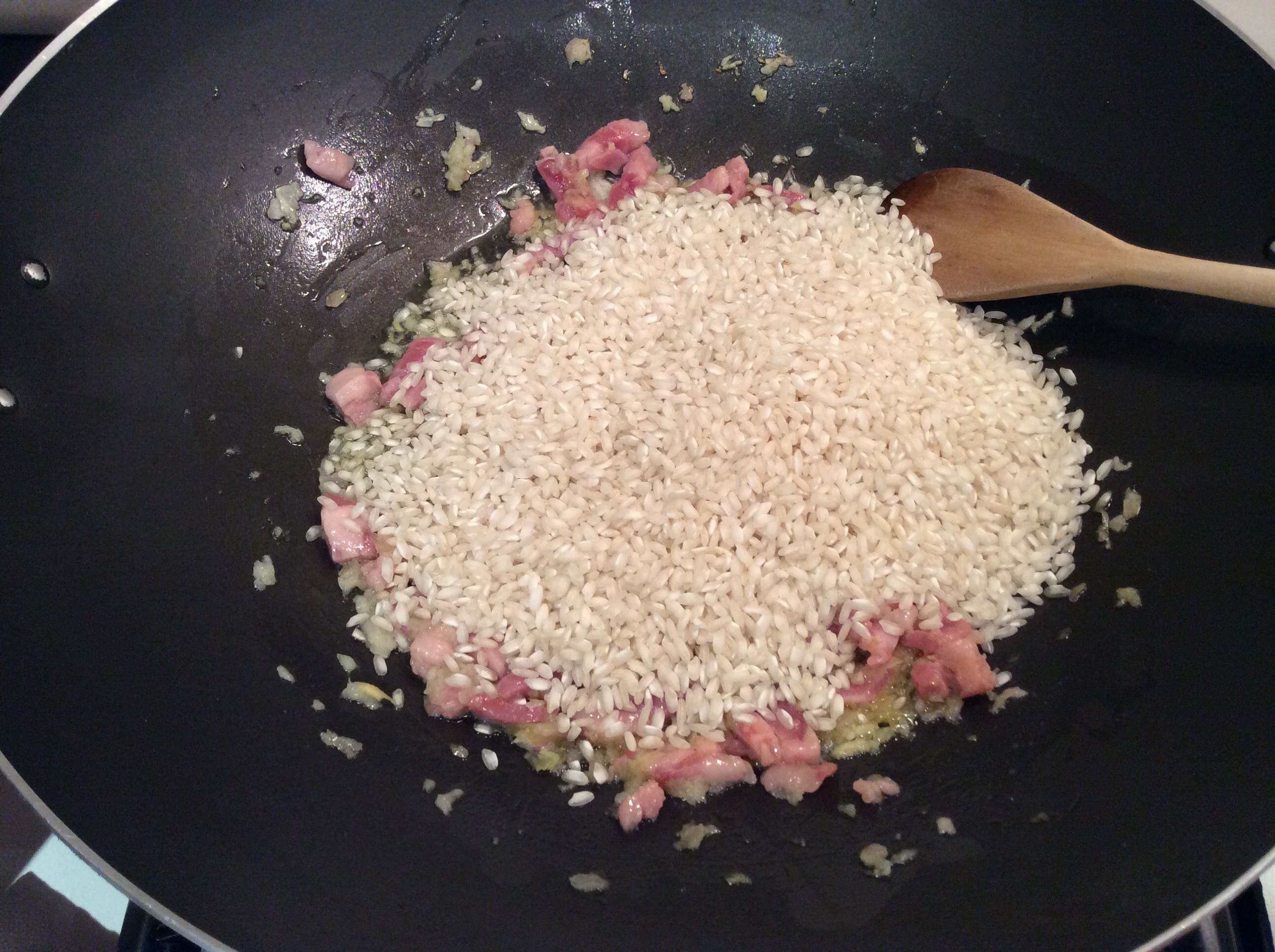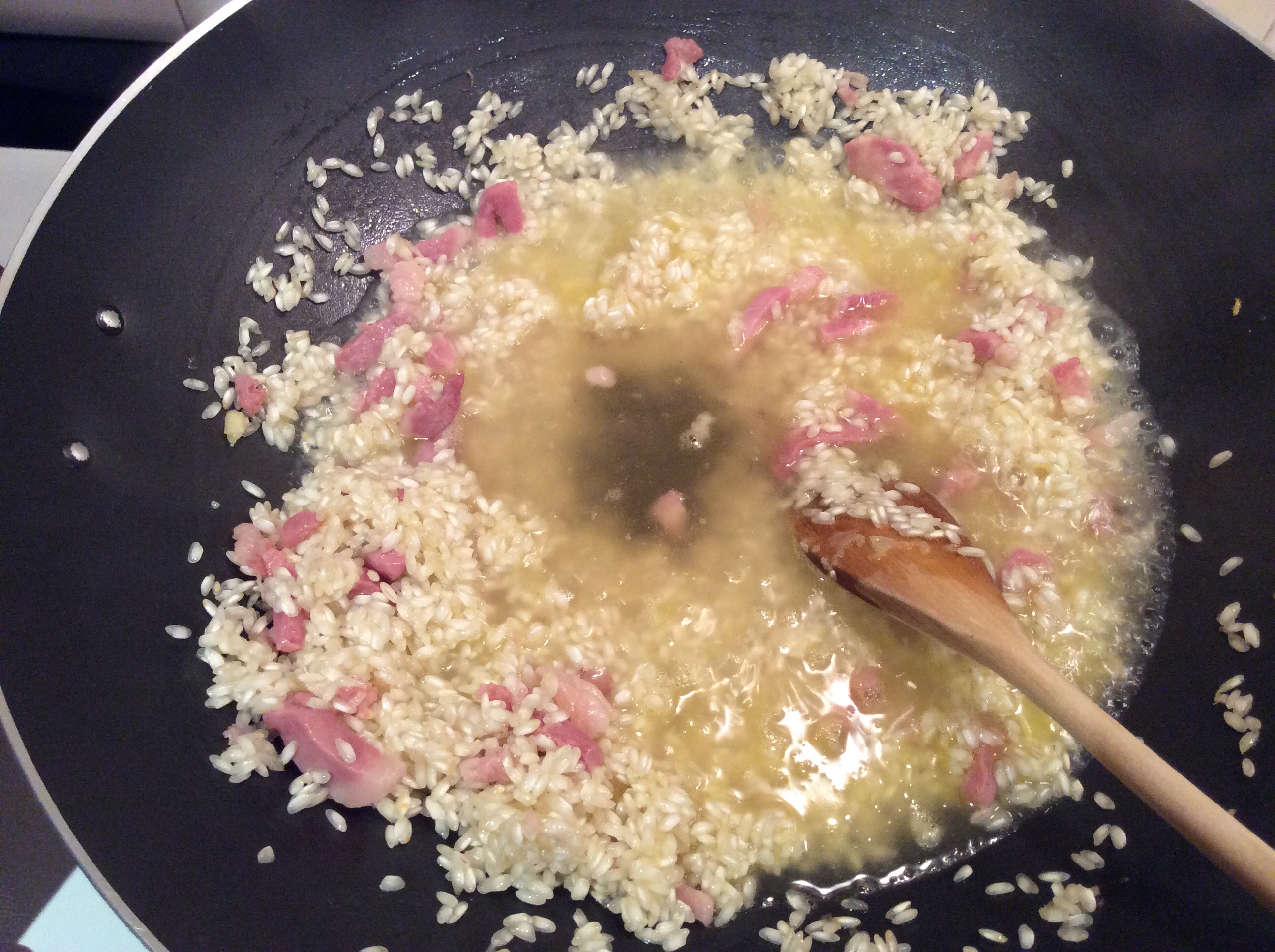 Aggiungo il riso e lo lascio tostare finché è molto caldo al tatto