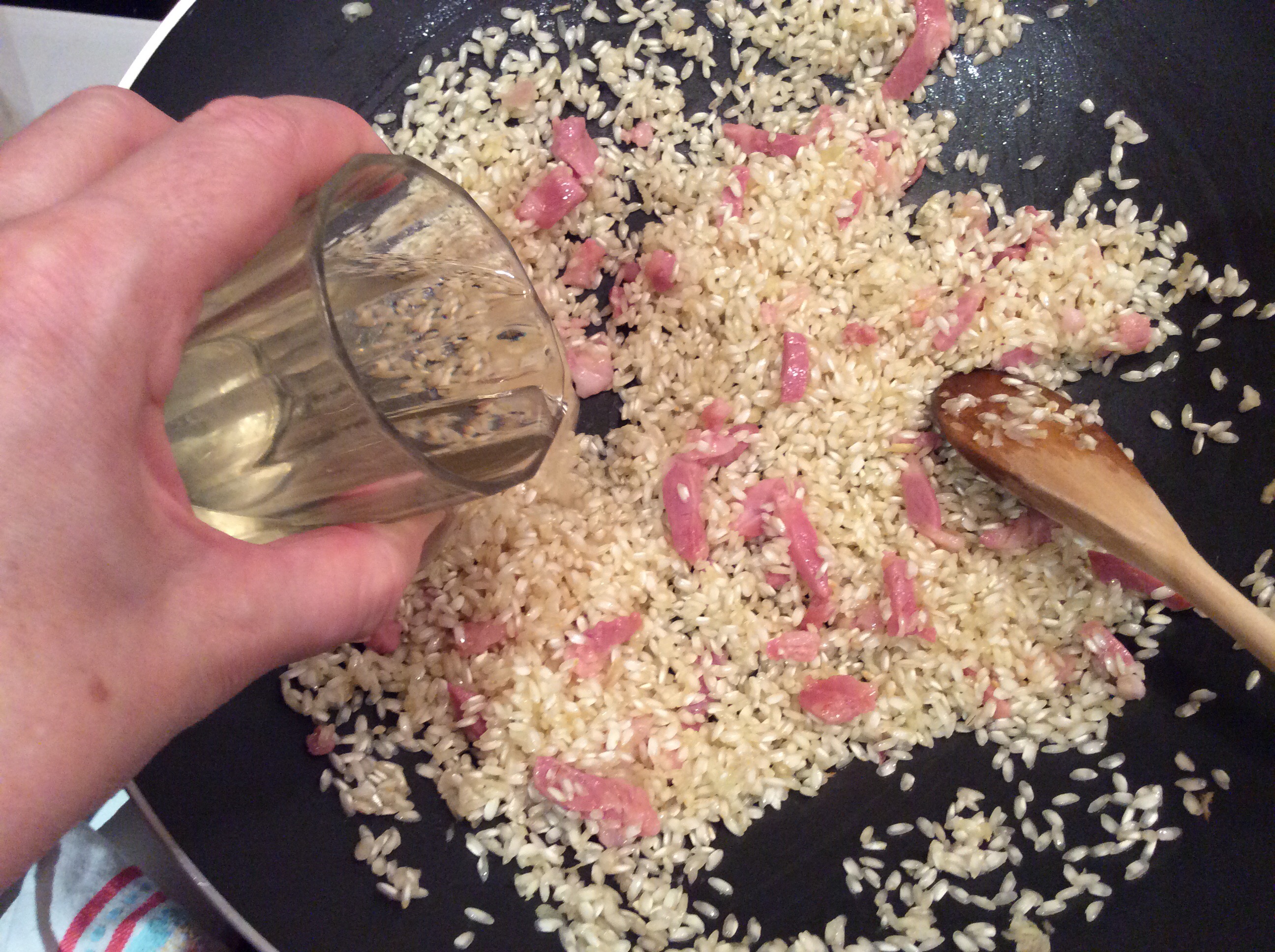 Sfumo con il vino bianco e lo lascio evaporare finché non sento più il suo profumo