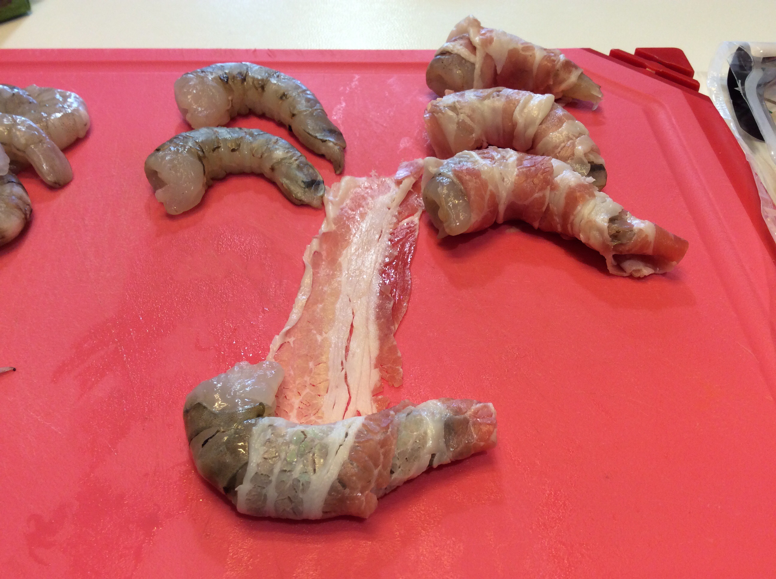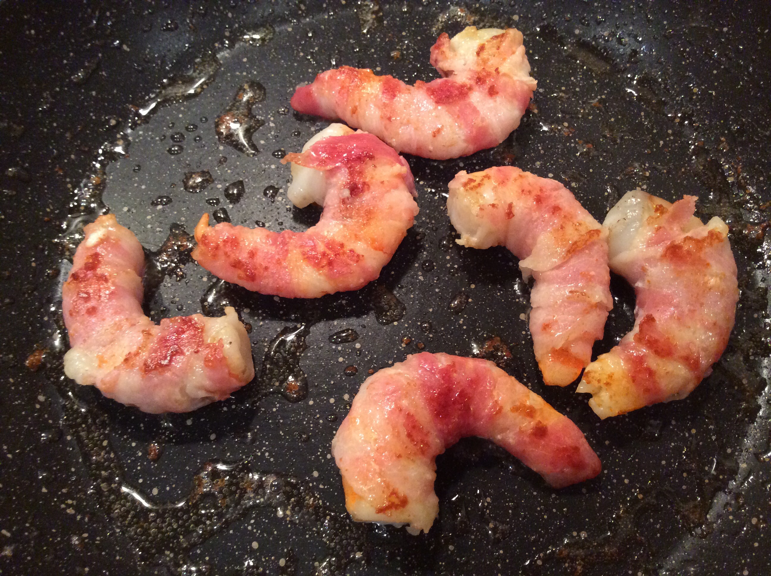 Nel frattempo avvolgo i gamberi interi nelle fettine di pancetta