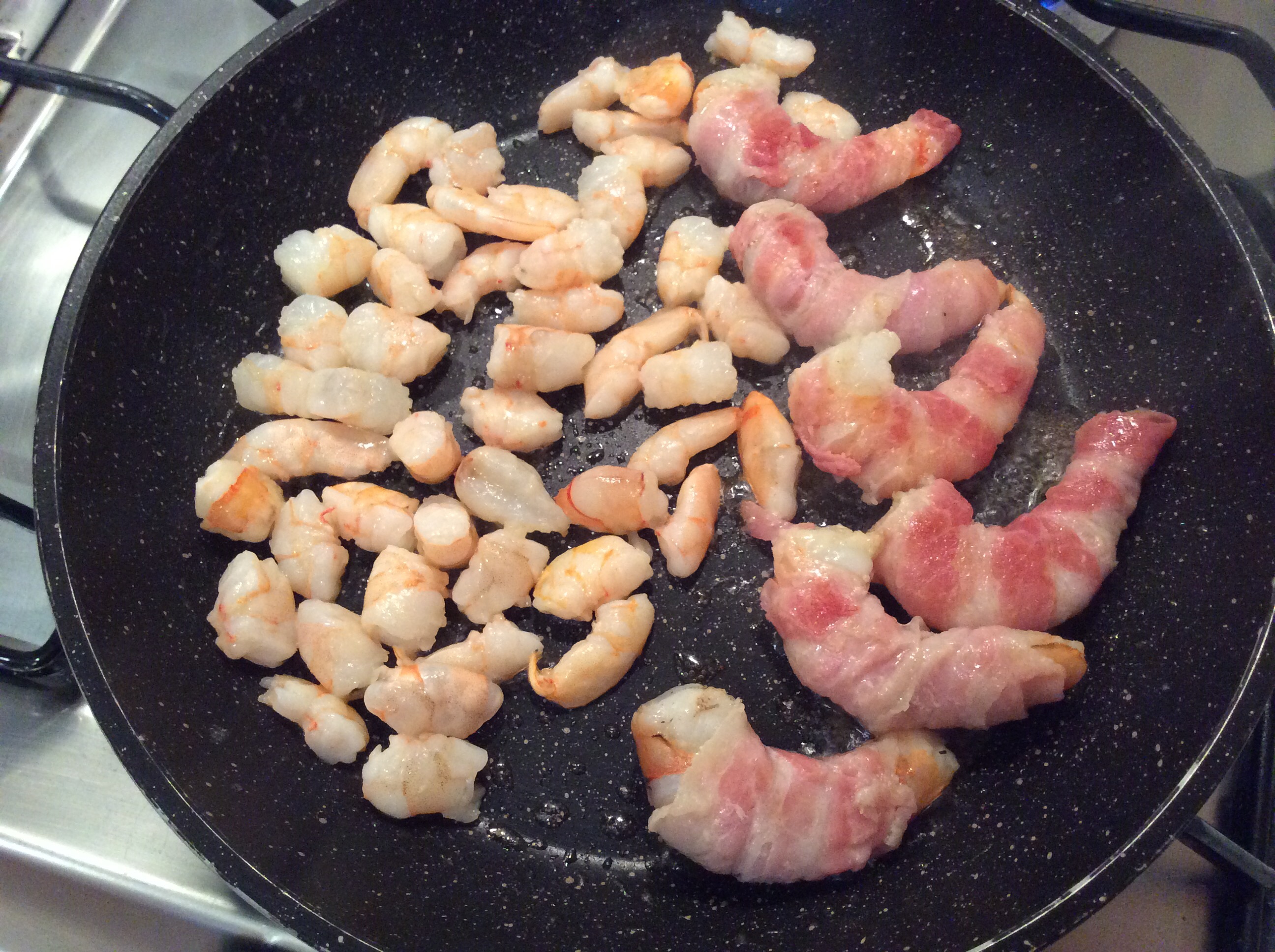 Ungo leggermente con poco olio un padellino antiaderente e aggiungo i gamberi a pezzetti e quelli avvolti nella pancetta e li lascio arrostire