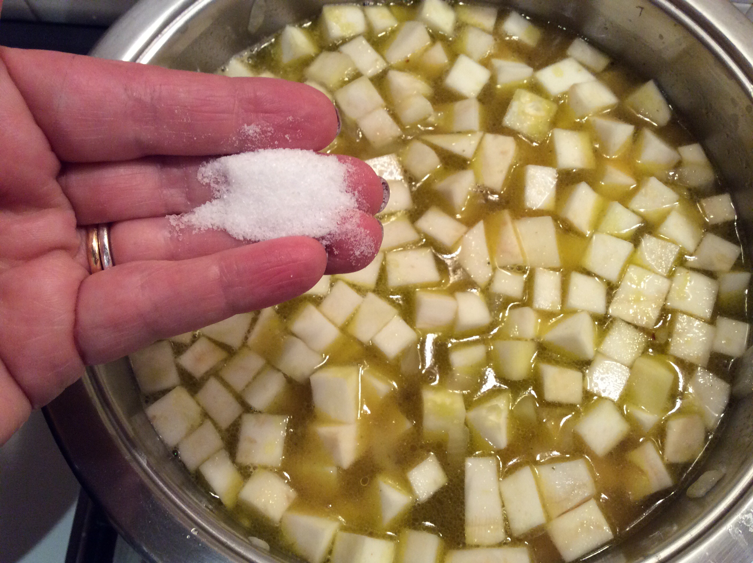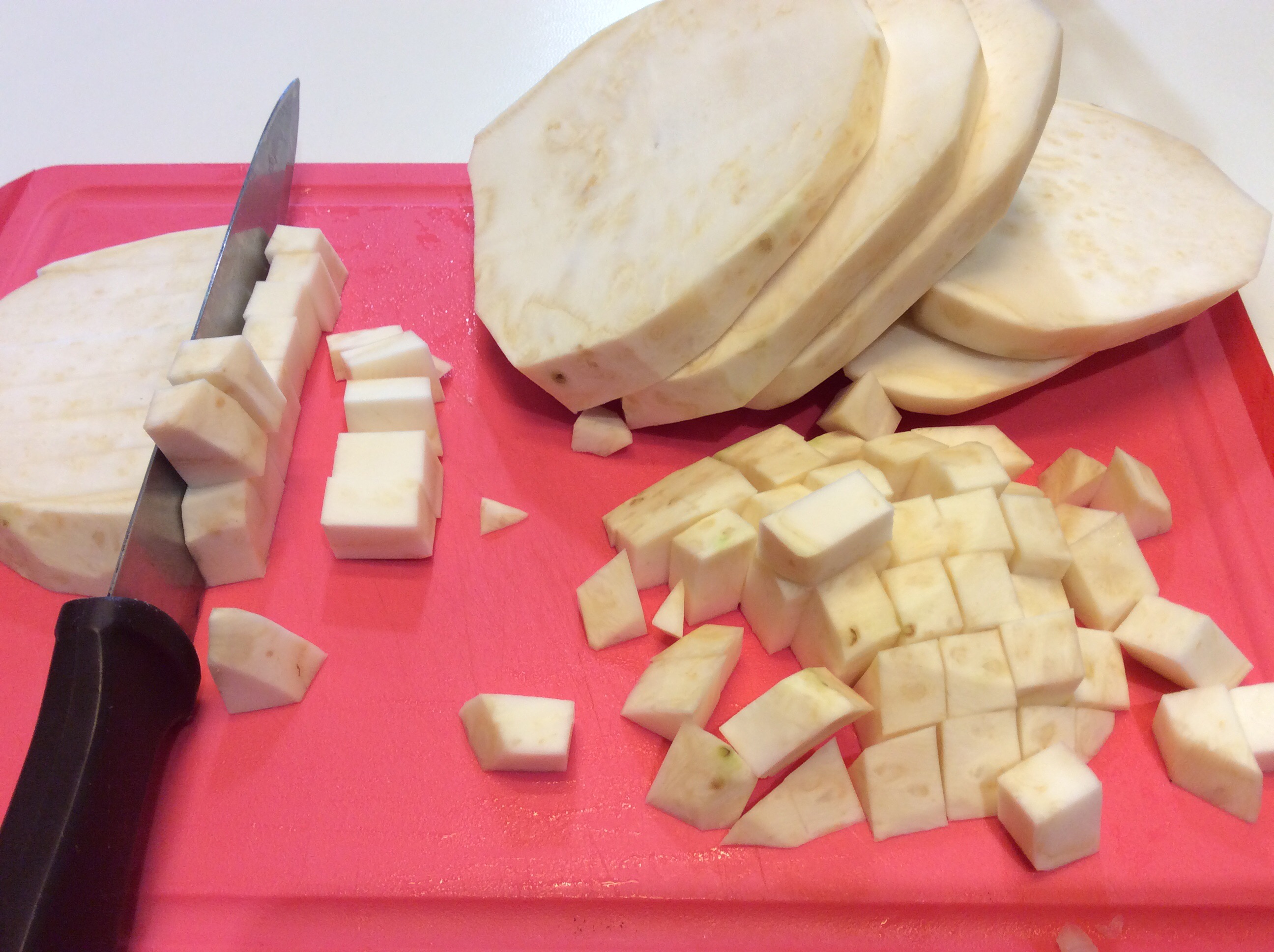 Taglio a fette poi a cubetti il sedano rapa