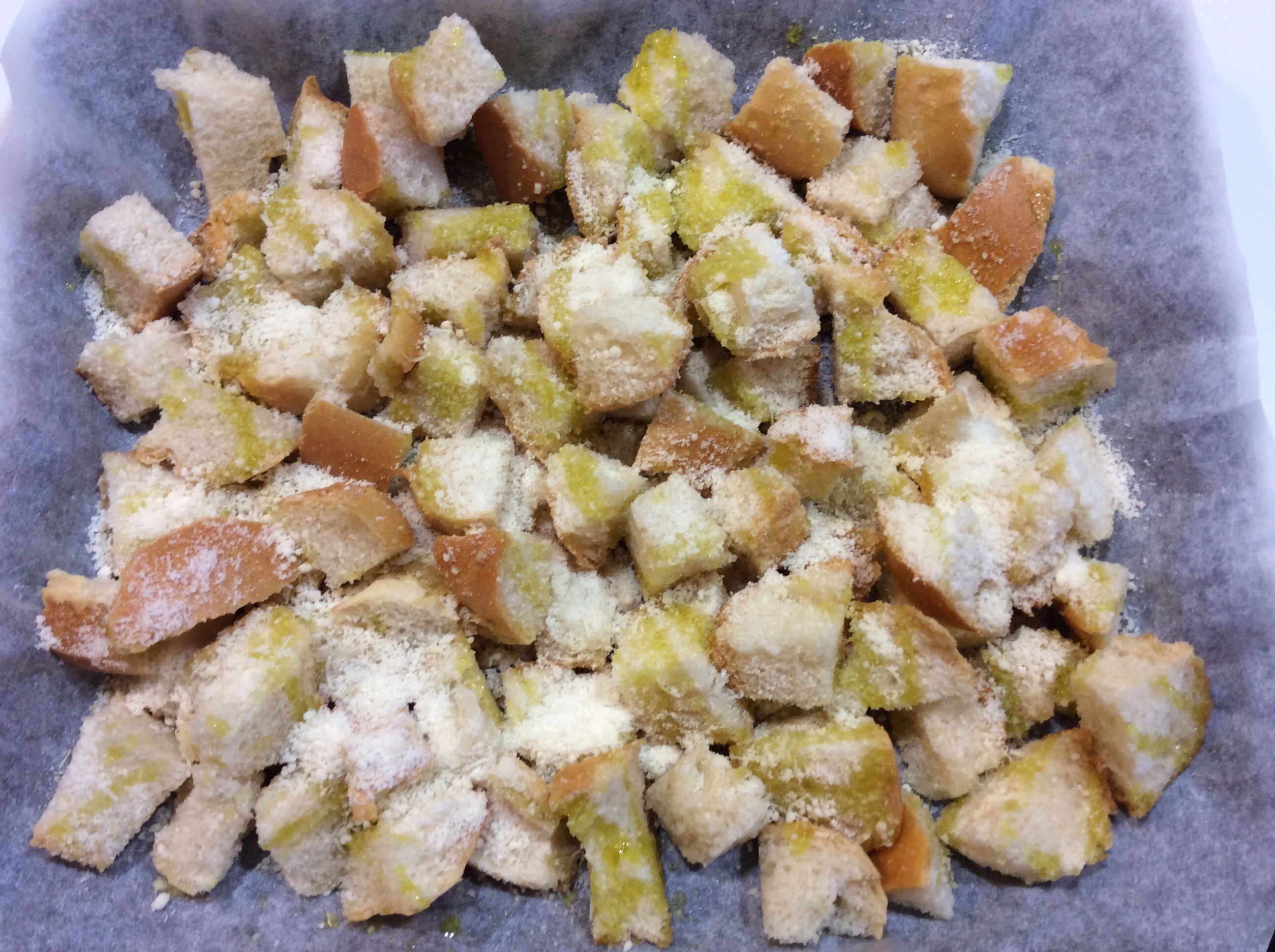 Taglio a cubetti del pane raffermo e lo appoggio su una teglia rivestita di carta forno, li ungo di olio e li cospargo di abbondante parmigiano, mescolo bene con le mani in modo che si ricoprano bene e inforno a 180 gradi finché inizino a colorire mescolandoli ogni tanto