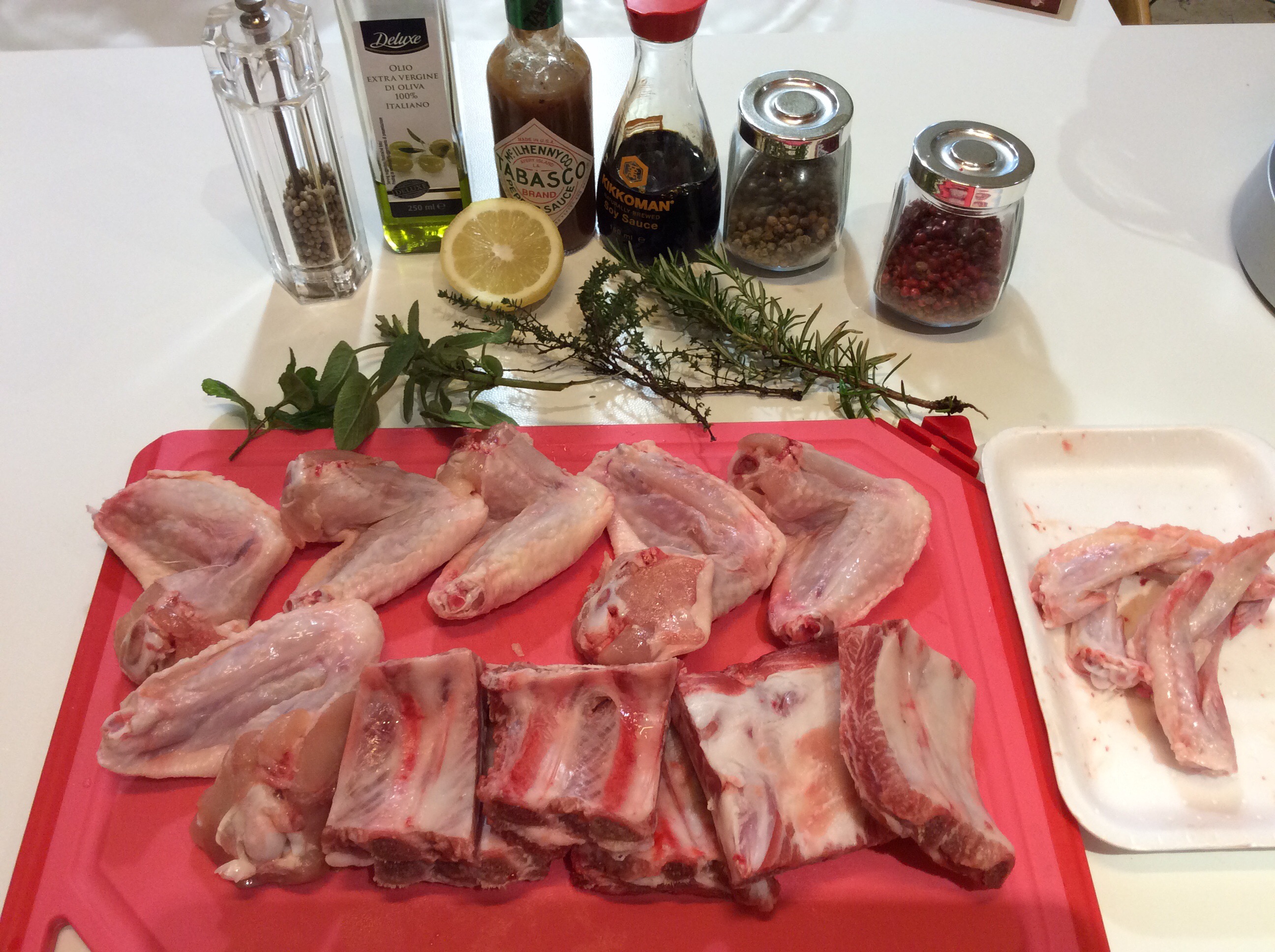 Taglio le costine a piccoli pezzi, spunto le alette di pollo togliendo eventuali pelucchi, le lavo e asciugo, le dosi decidetele voi in base ai vostri ospiti, io vi dimostro il metodo “NIGELLA “, veloce e senza sporcare