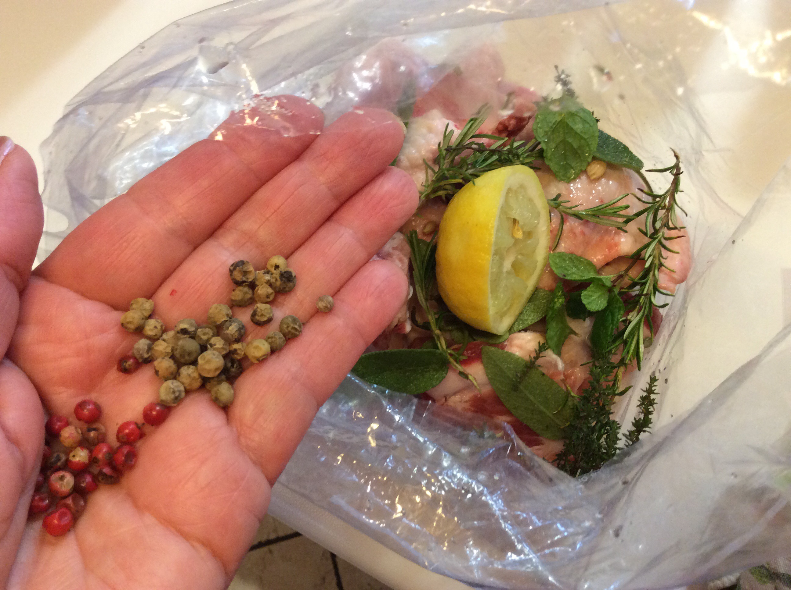 Taglio il limone ben lavato, lo spremo e lo introduco nel sacchetto con alcuni grani di pepe rosa e verde