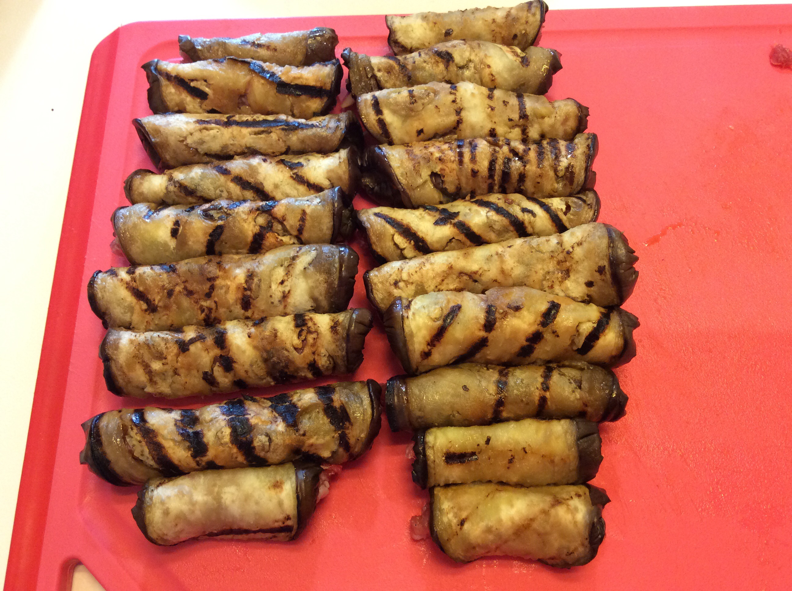 In ogni fettina di melanzane dispongo un rotolino di salsiccia