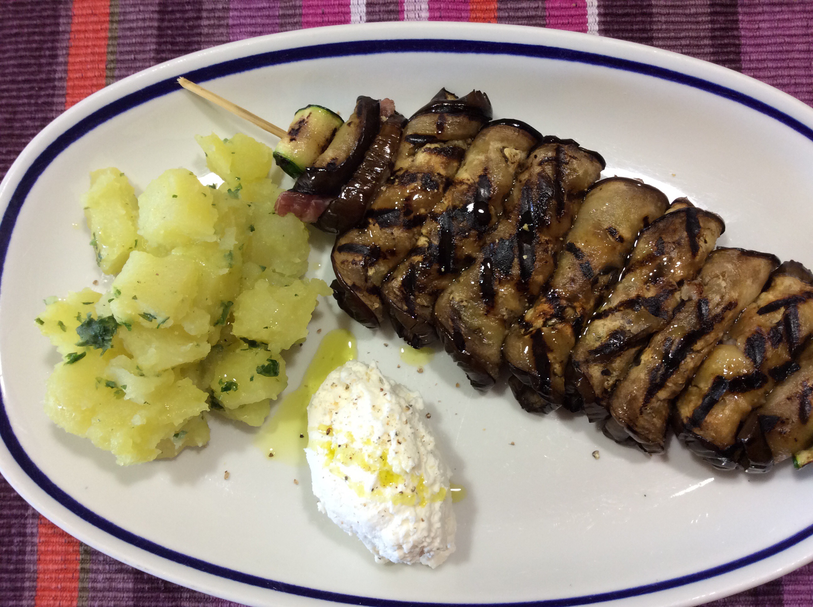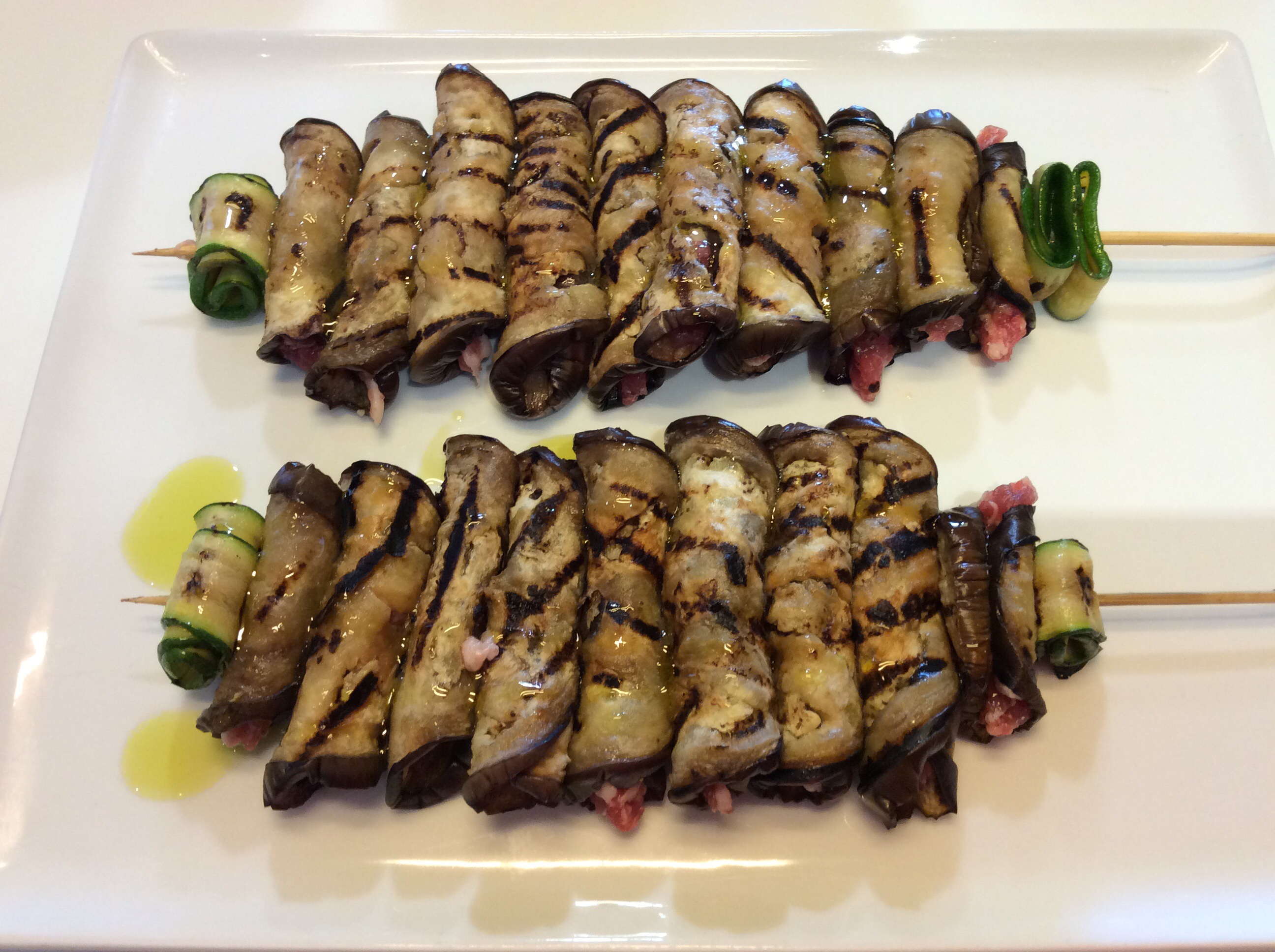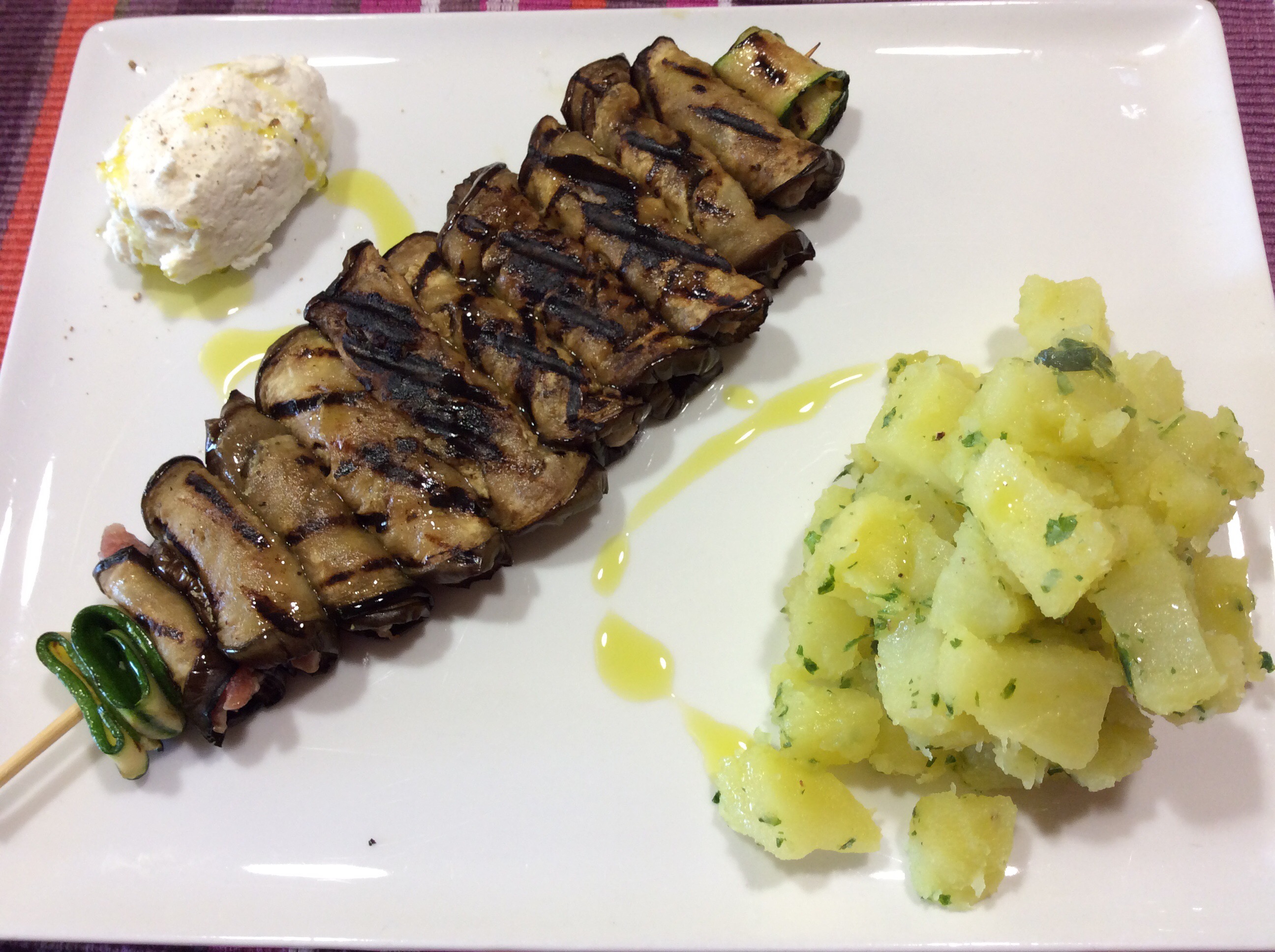 Scaldo sulla piastra lo spiedino e sistemo tutto nei piatti
