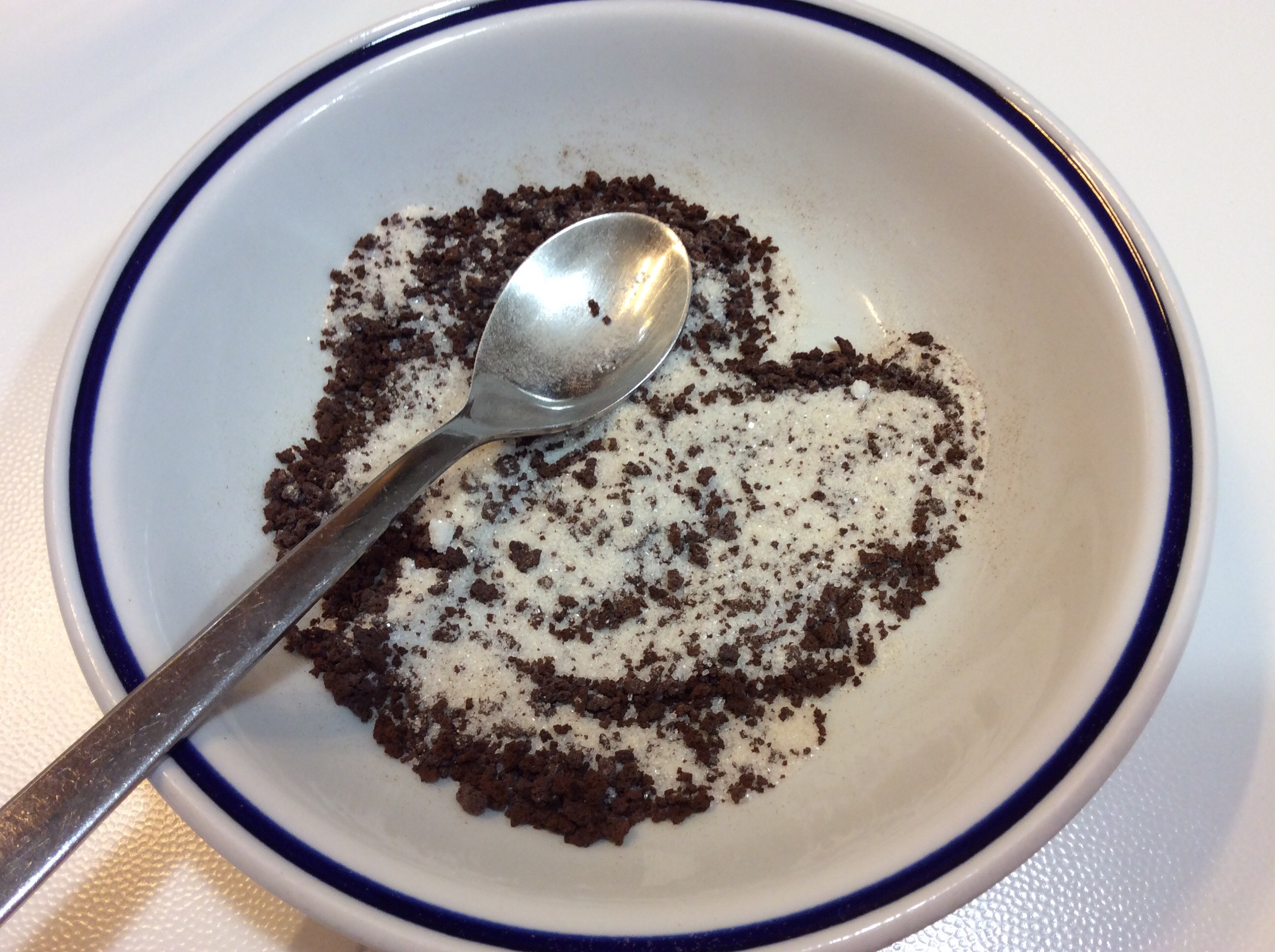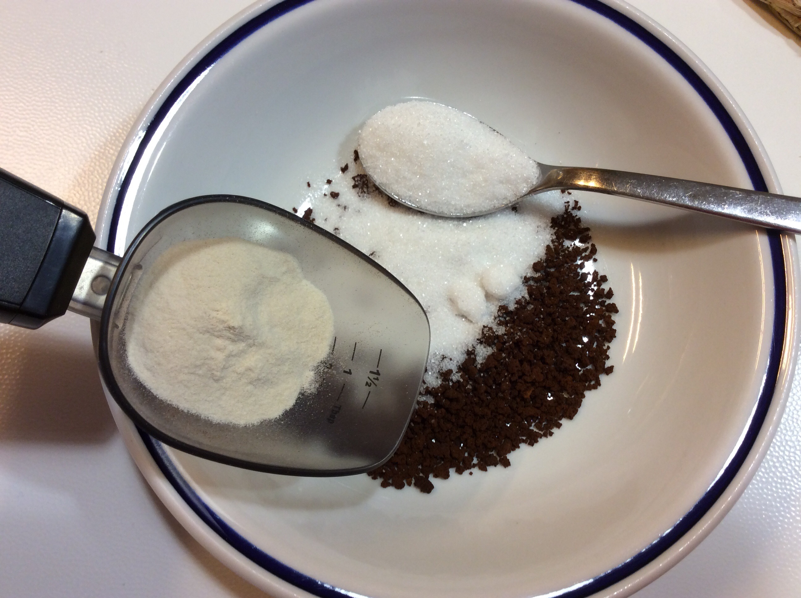 In una ciotolina unisco un paio di cucchiai dello zucchero della dose con il caffè liofilizzato e l’agar agar