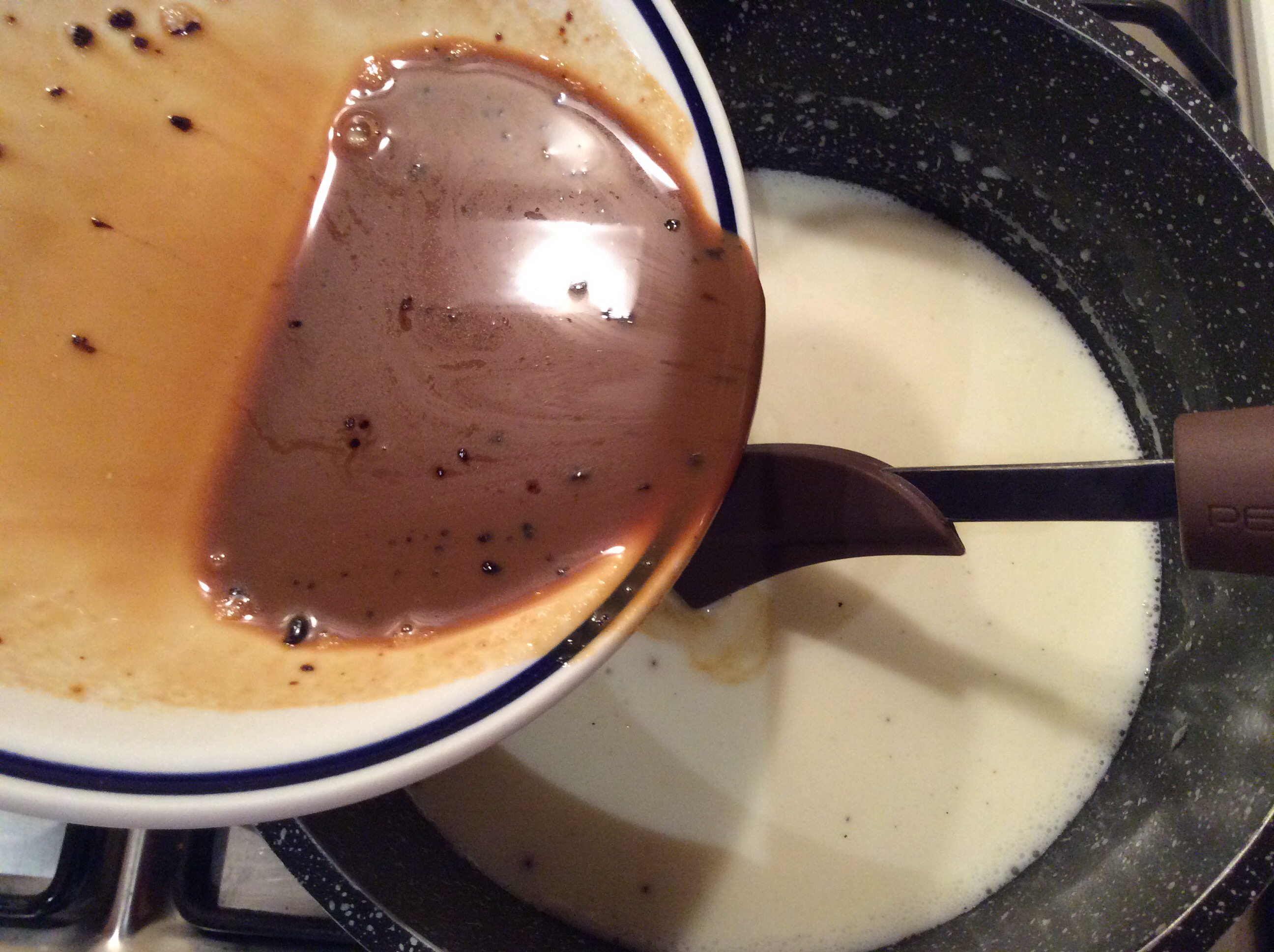 Porto a bollore, abbasso la fiamma e lascio sobbollire per 3 minuti sempre mescolando, il composto resta liquido, si addensa raffreddandosi