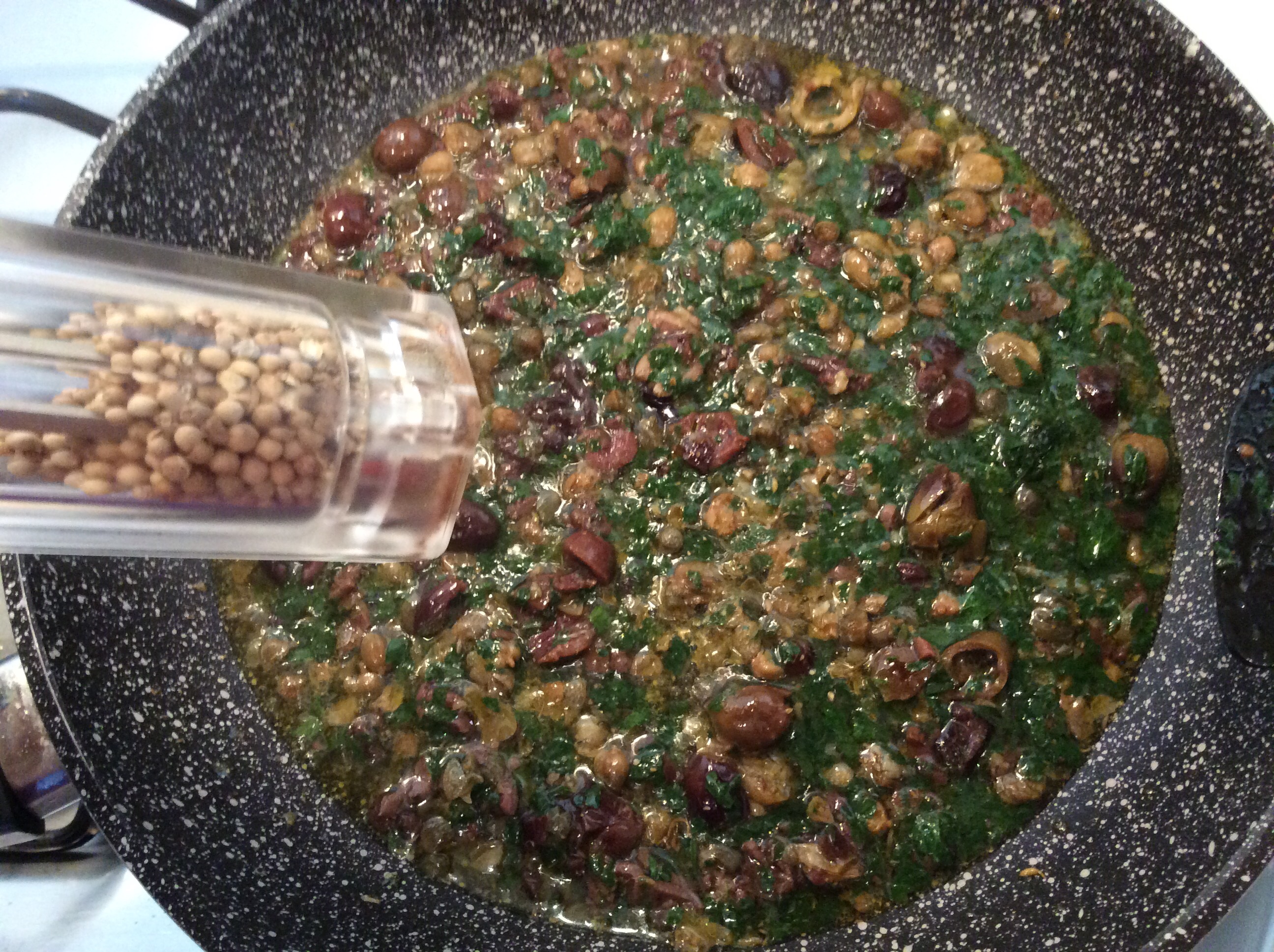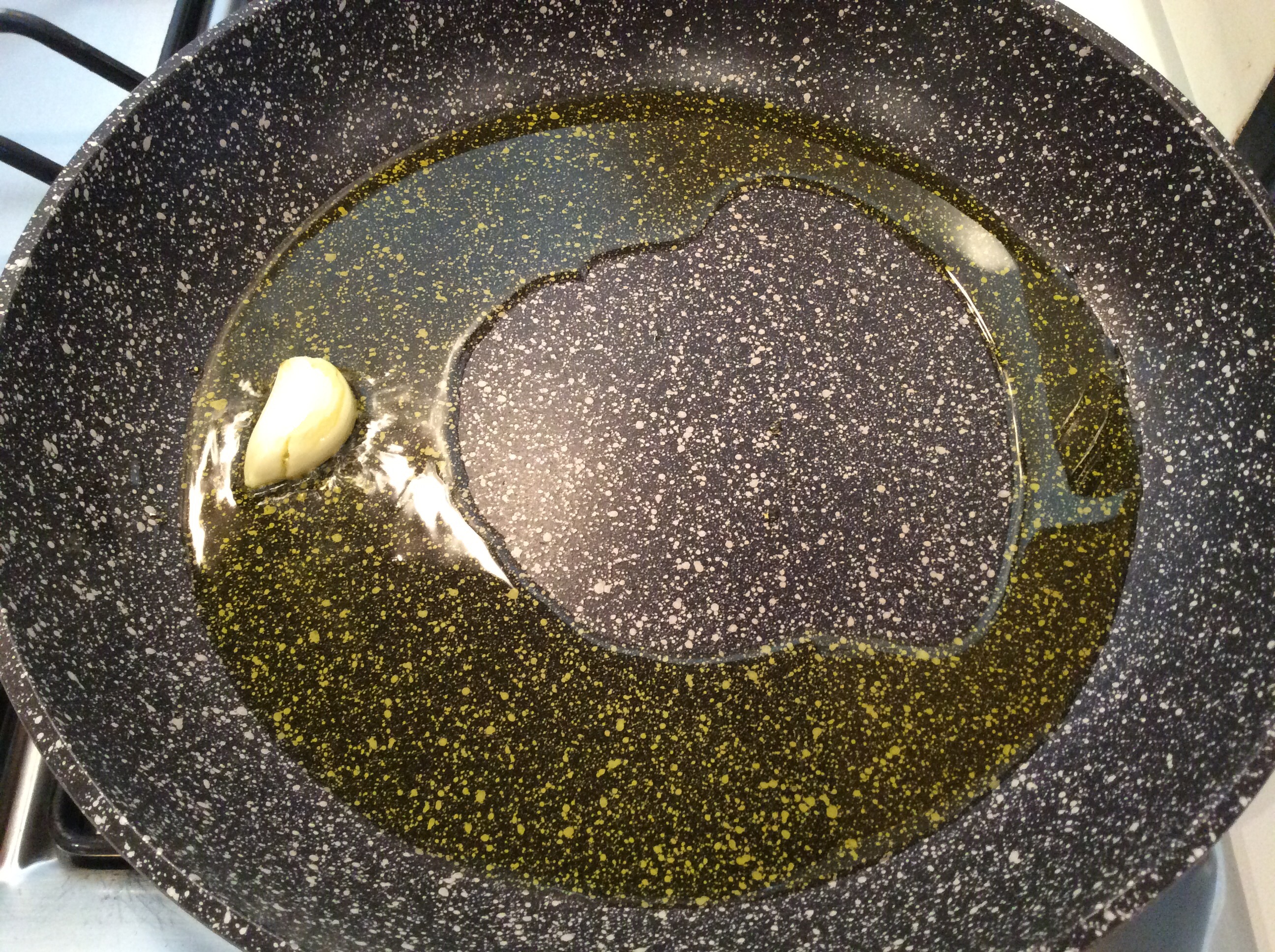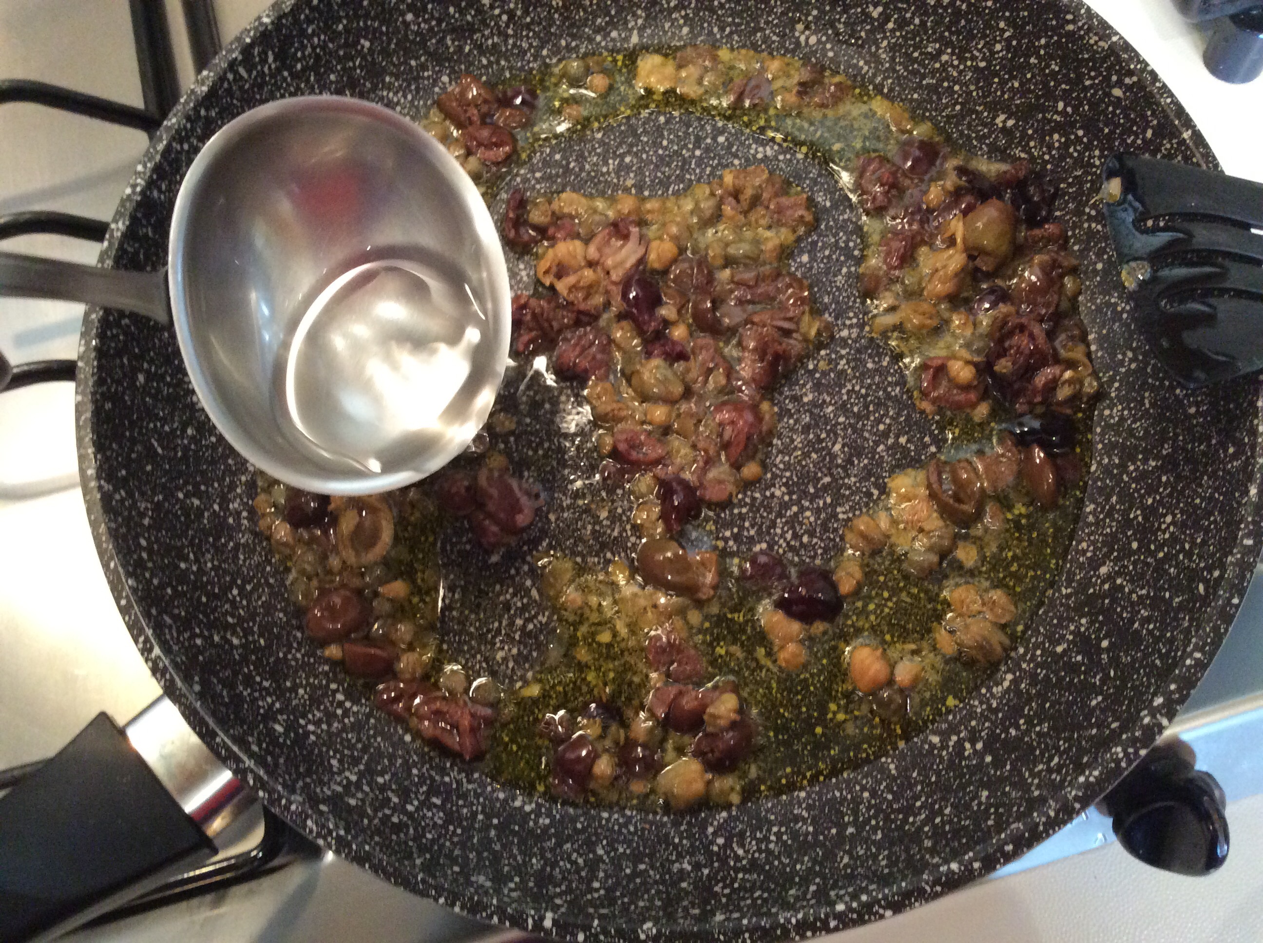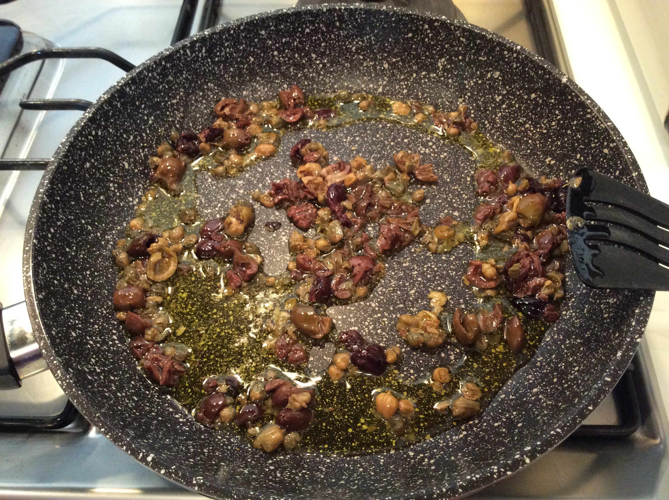 Tolgo dalla padella l’aglio che ha soffritto e aggiungo capperi e olive