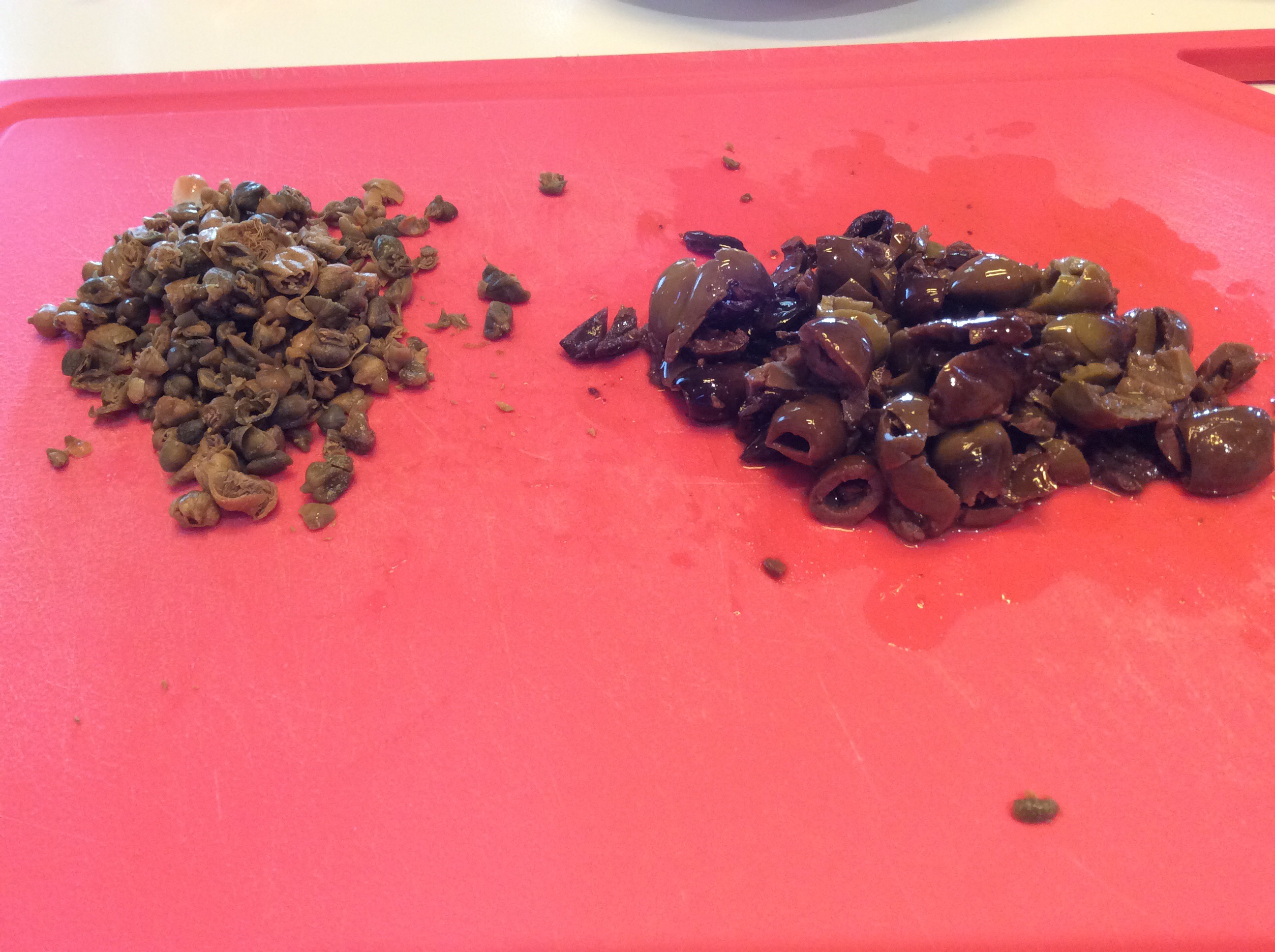 Trito grossolanamente i capperi che ho dissalato e le olive