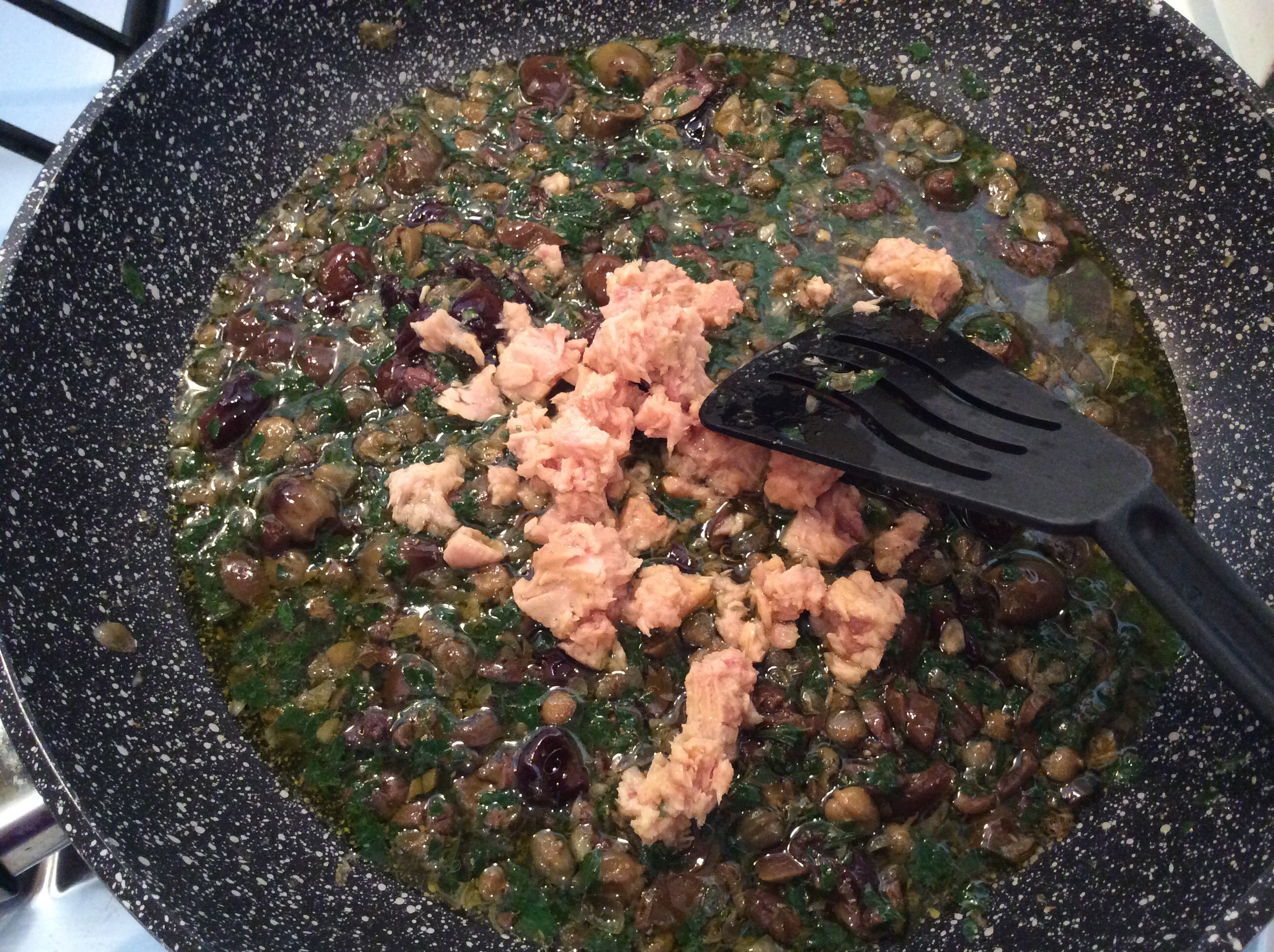 Spengo la fiamma e aggiungo il tonno sbriciolato