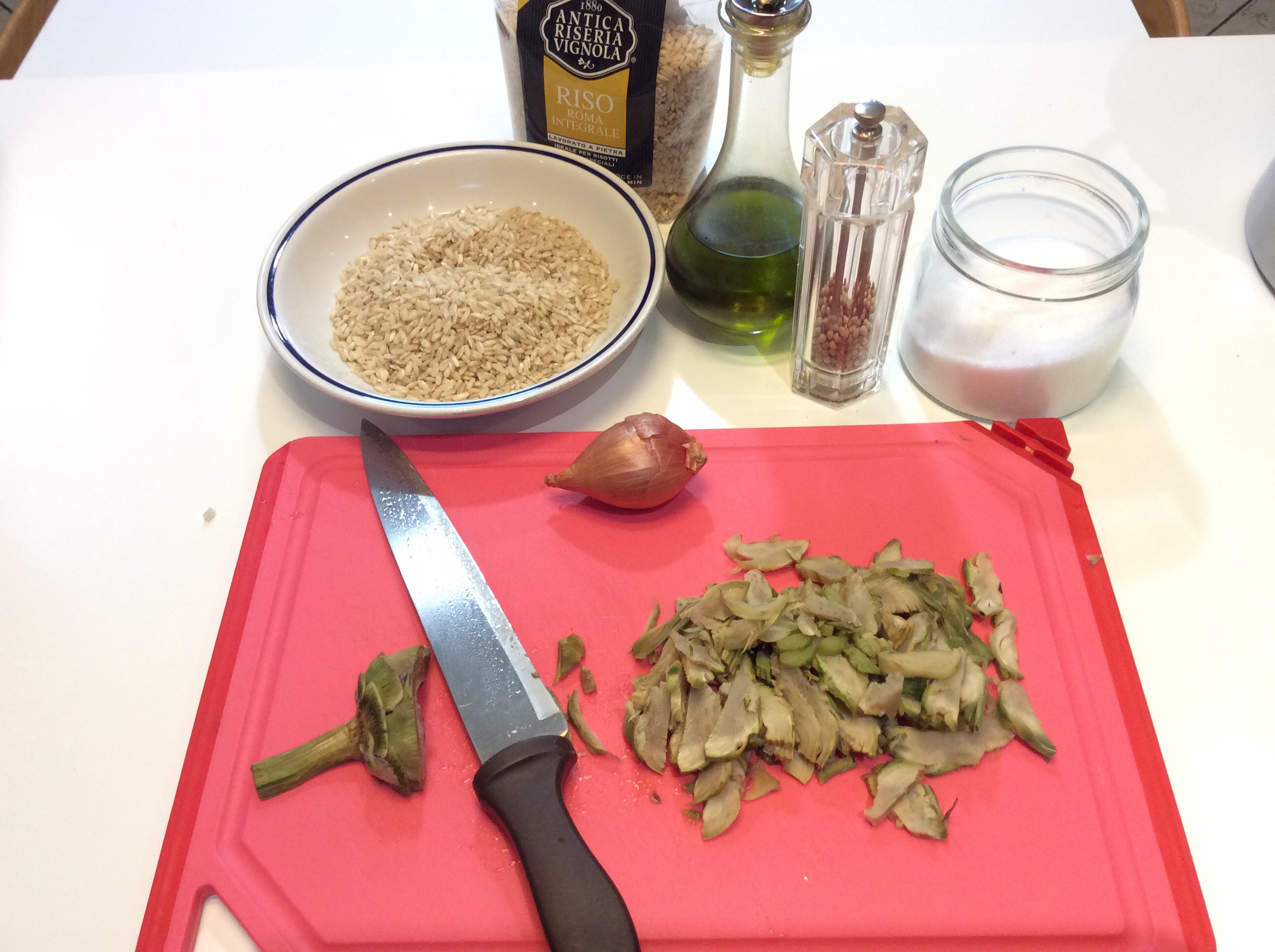 Pulisco i carciofi eliminando le parti dure tenendo il cuore e li affetto sottilmente, io ho adoperato i carciofi che avevo surgelato precedentemente