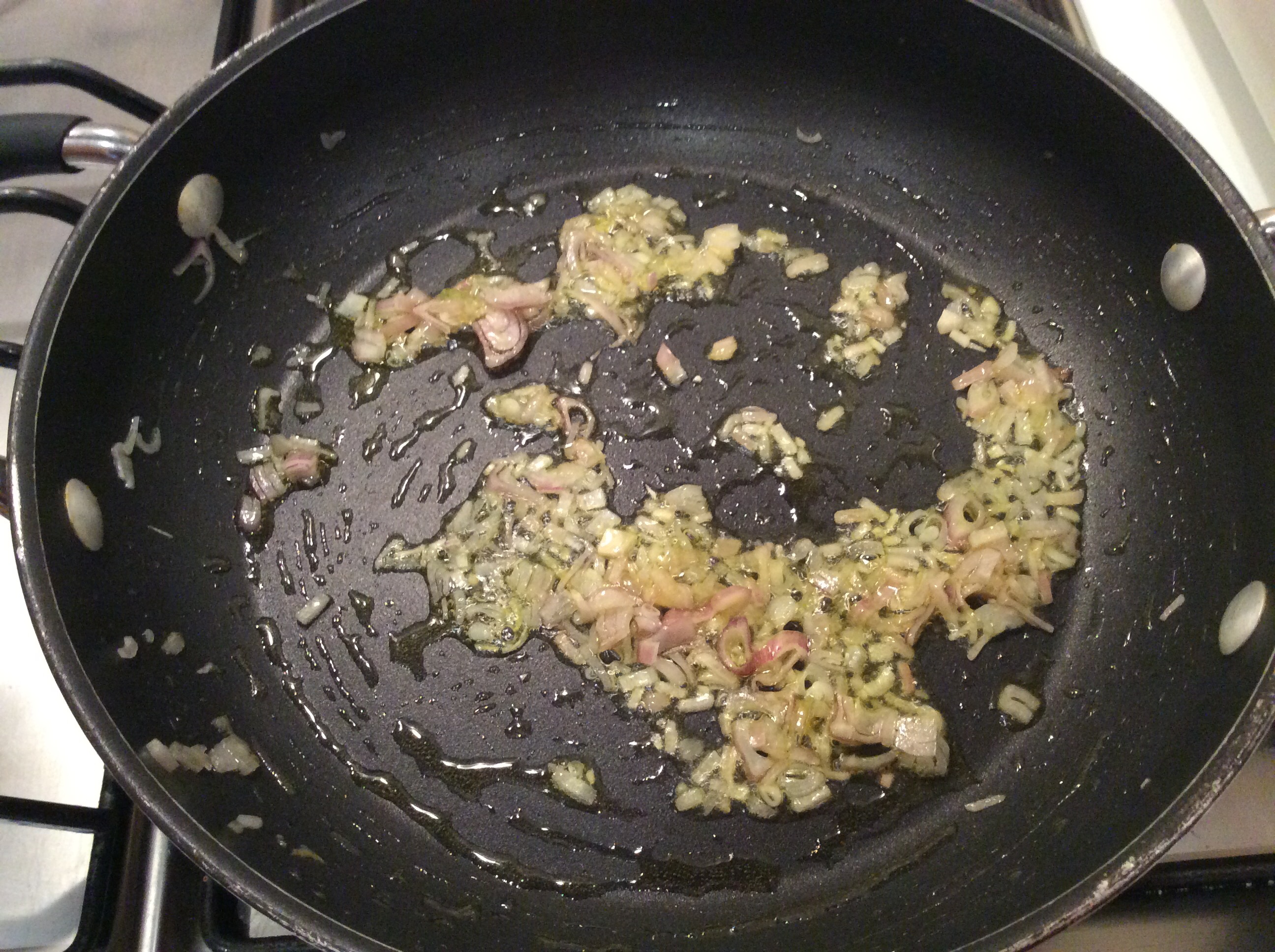 In una padella aggiungo l’olio e lo scalogno e lo lascio rosolare