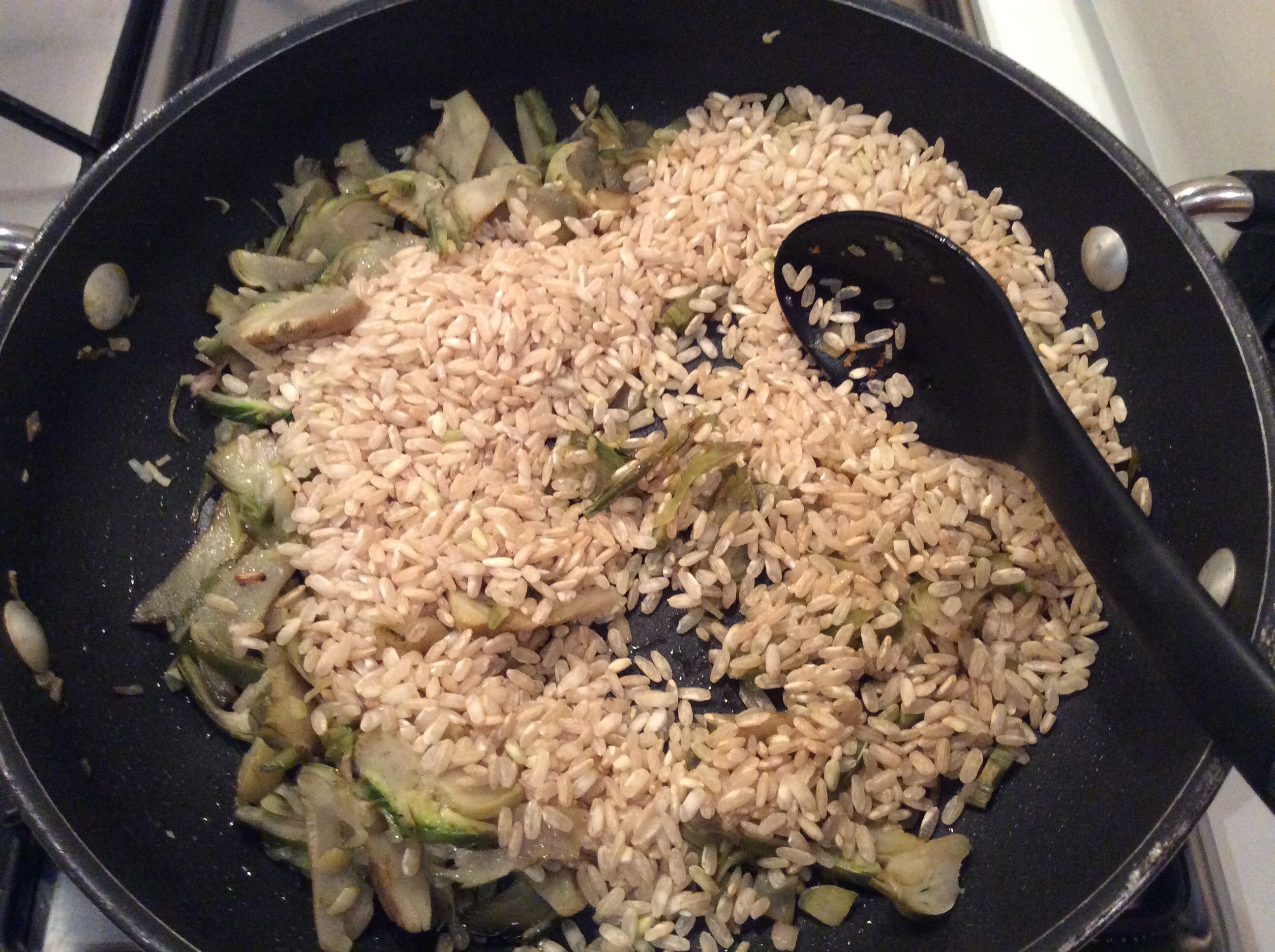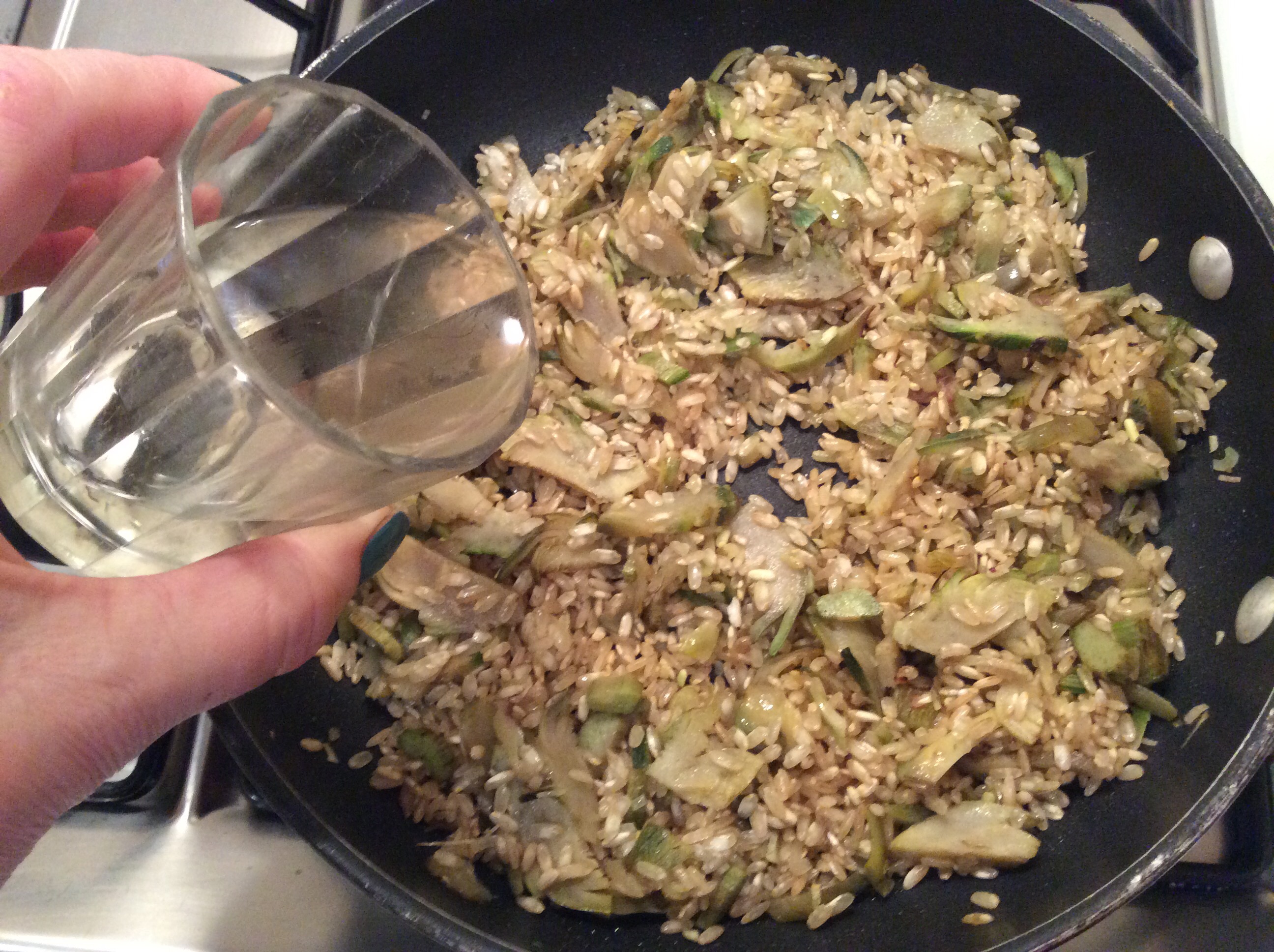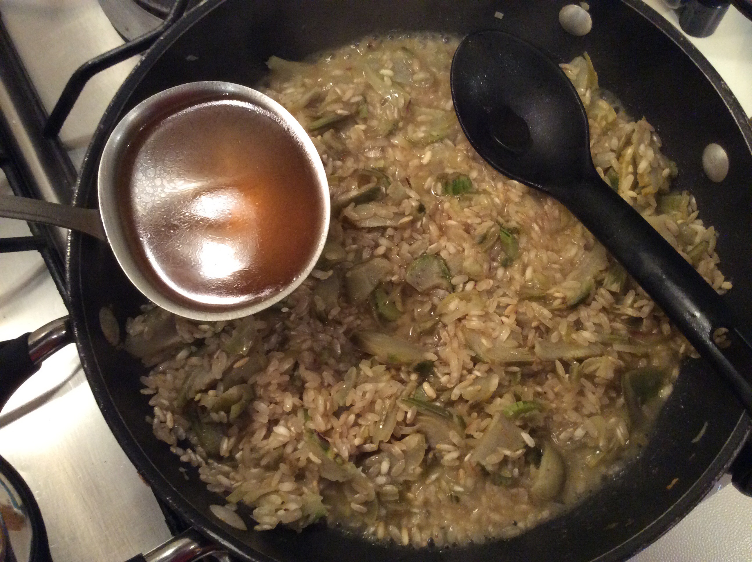 Quando non sento più il profumo del vino aggiungo pian piano il brodo bollente continuando a mescolare