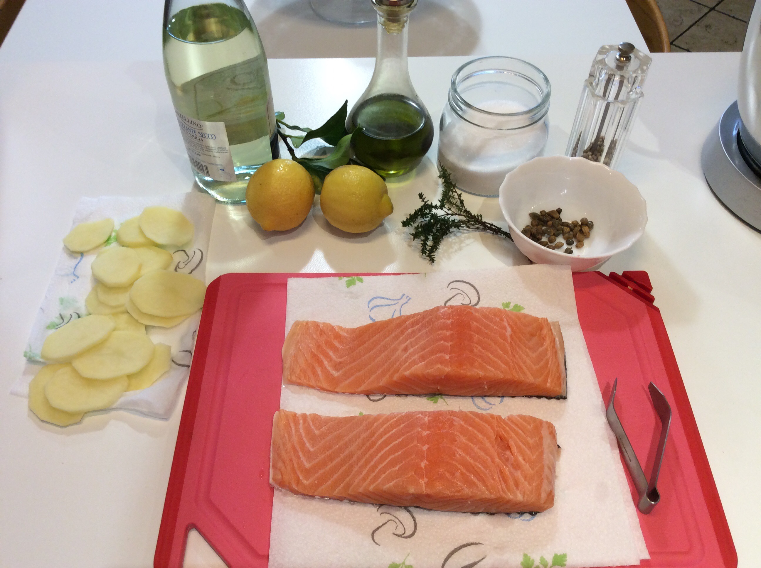 Lavo bene ed asciugo i tranci di salmone che devono avere la pelle, con l’apposita pinzetta tolgo le lische