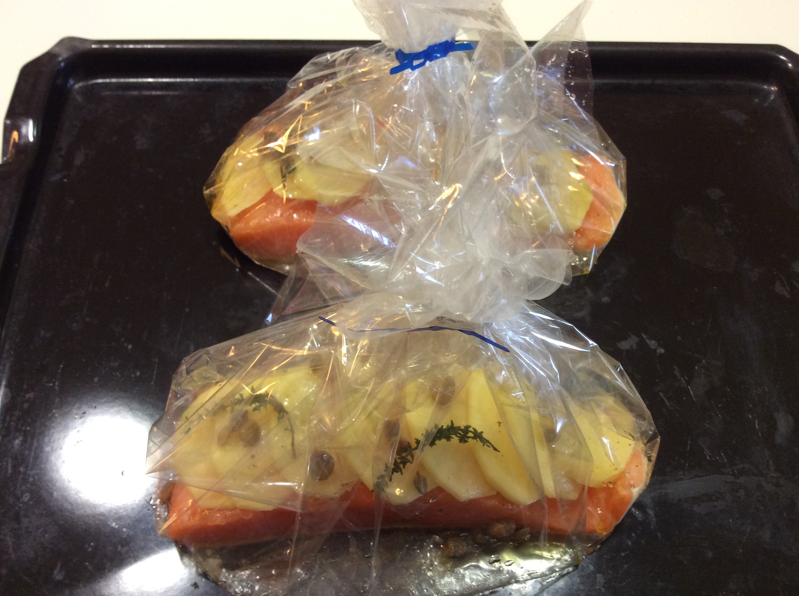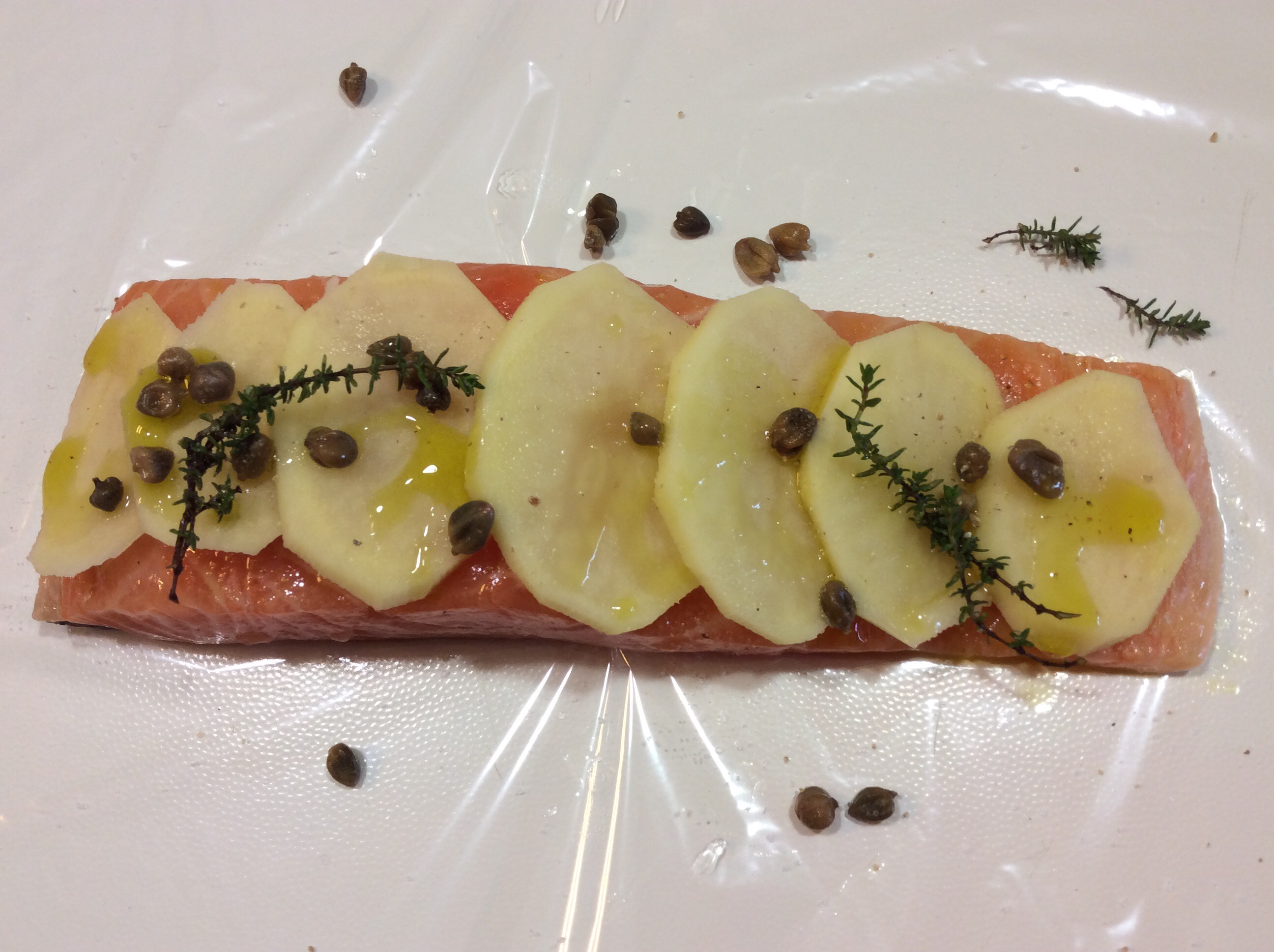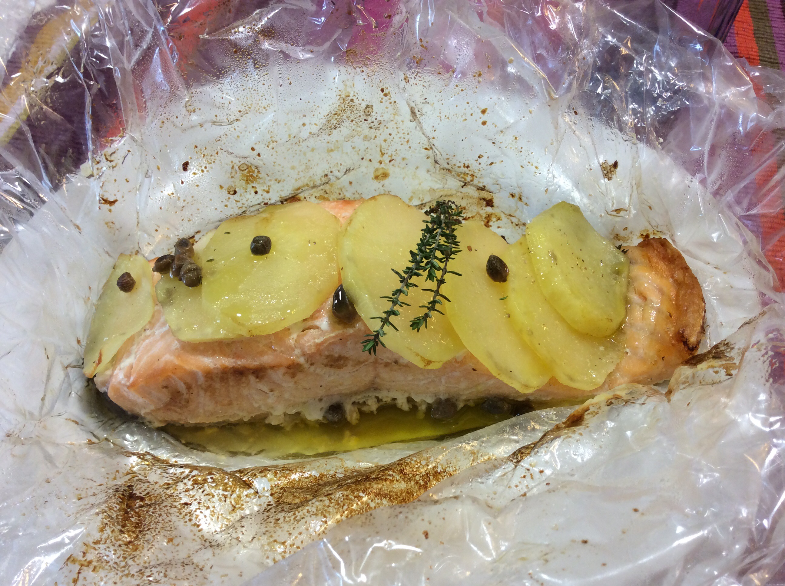 Taglio un grande quadrato di carta fata, (carta trasparente da forno) oppure la comune carta forno, appoggio il trancio, distribuisco le patate allineate sovrapposte, distribuisci i capperi e qualche rametto di timo, aggiungo un filo di olio e ancora pochissimo sale e pepe