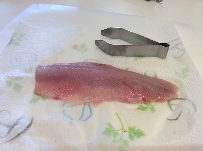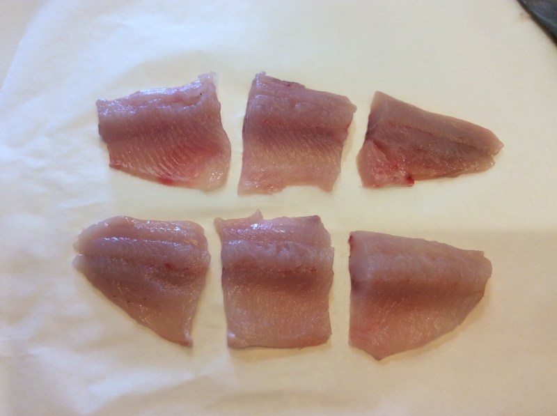 Taglio ogni filetto in tre parti e li appoggio su un foglio di carta forno