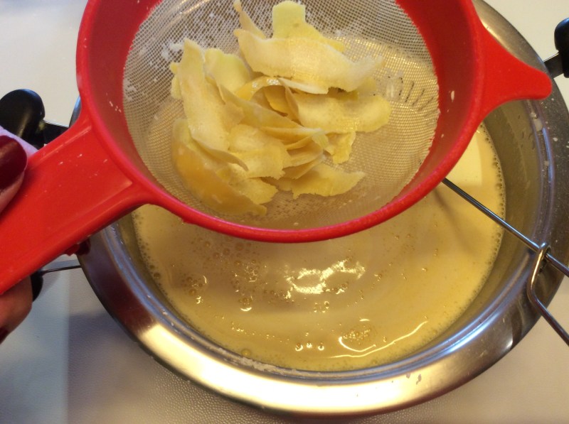 In un pentolino verso il latte, aggiungo la buccia (solo la parte gialla) del limone e la bacca di vaniglia dopo aver estratto i semi, porto a bollore