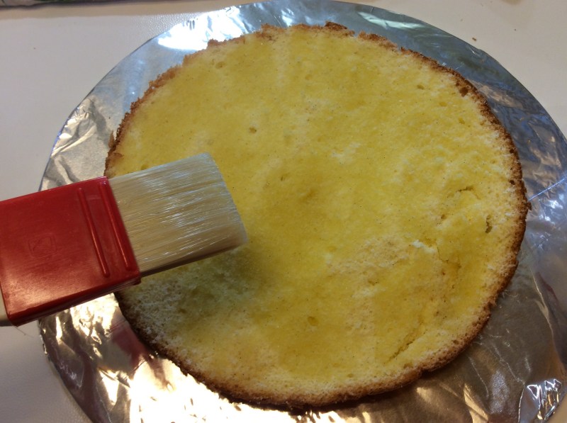 Con un pennello da cucina inzuppo il primo disco con lo sciroppo che ho ottenuto sciogliendo acqua e zucchero e fuori dal fuoco ho unito il limoncello