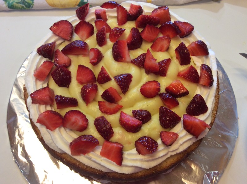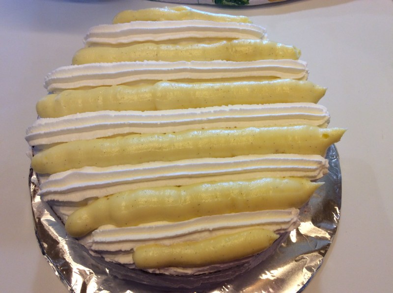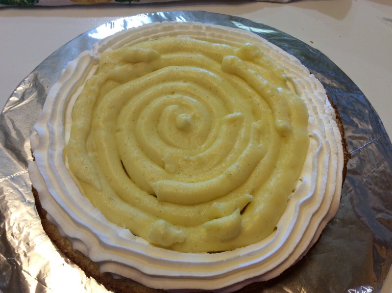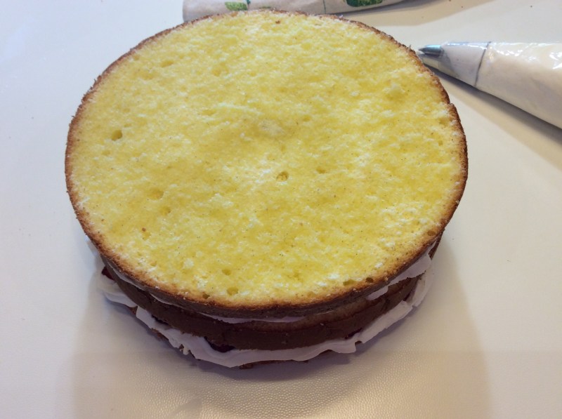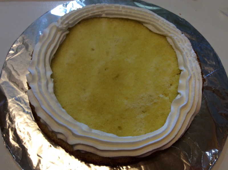 Ricopro con il secondo disco di Pan di Spagna e lo inzuppo con la bagna e farcisco nella stessa maniera del precedente, finisco con il terzo disco di Pan di Spagna sempre inzuppato