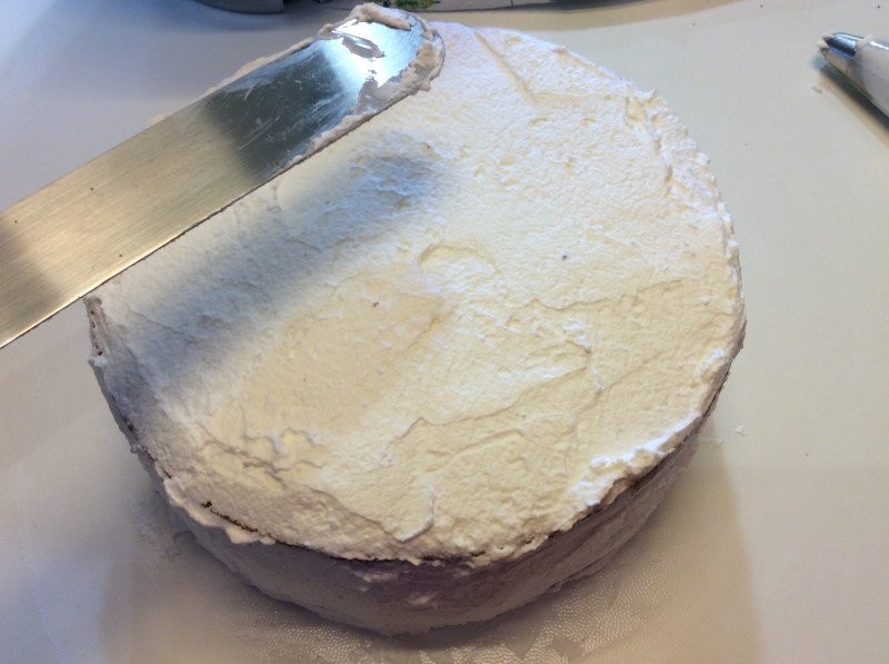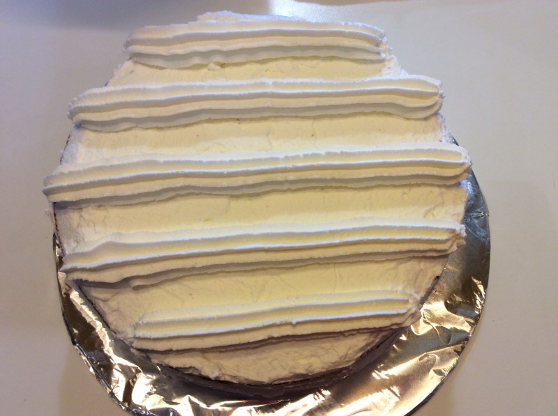 A questo punto ricopro tutta la superficie della torta con la panna montata e la liscio con una spatola
