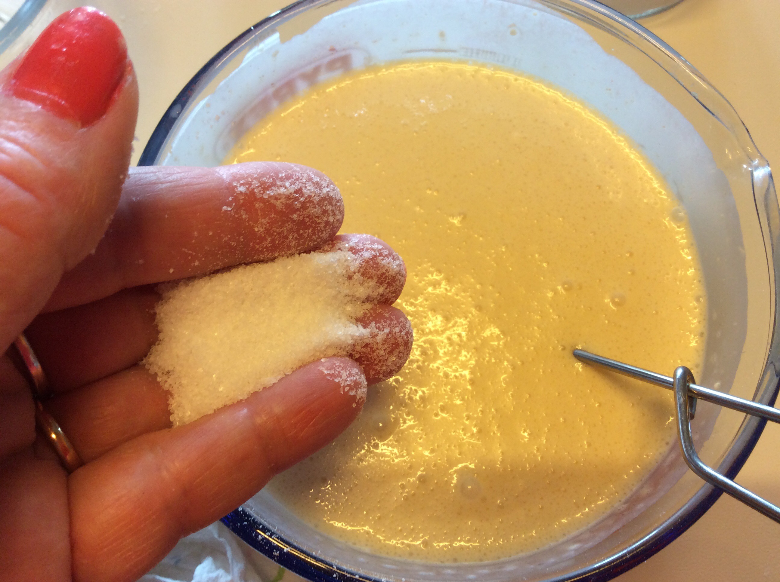 Aggiungo un pizzico di sale , mescolo bene con una frustina per evitare grumi