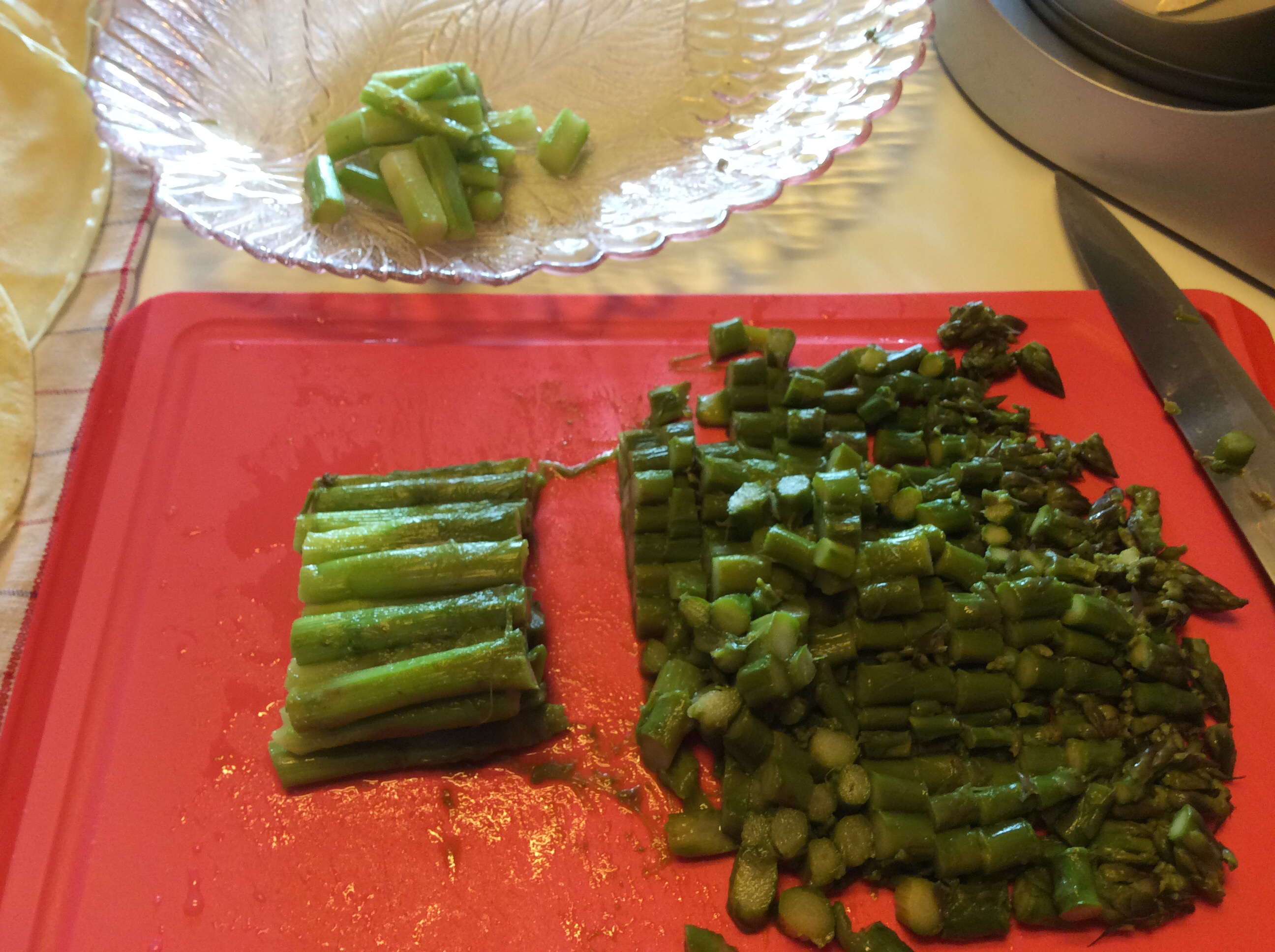 Dopo aver lessato gli asparagi elimino la parte più dura, taglio a pezzetti le punte e la parte più tenera del gambo